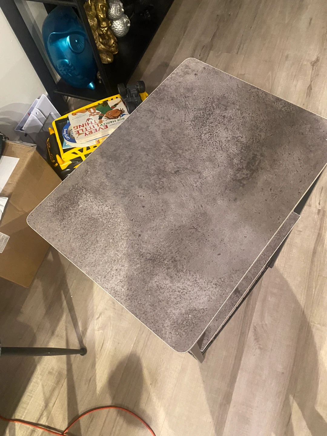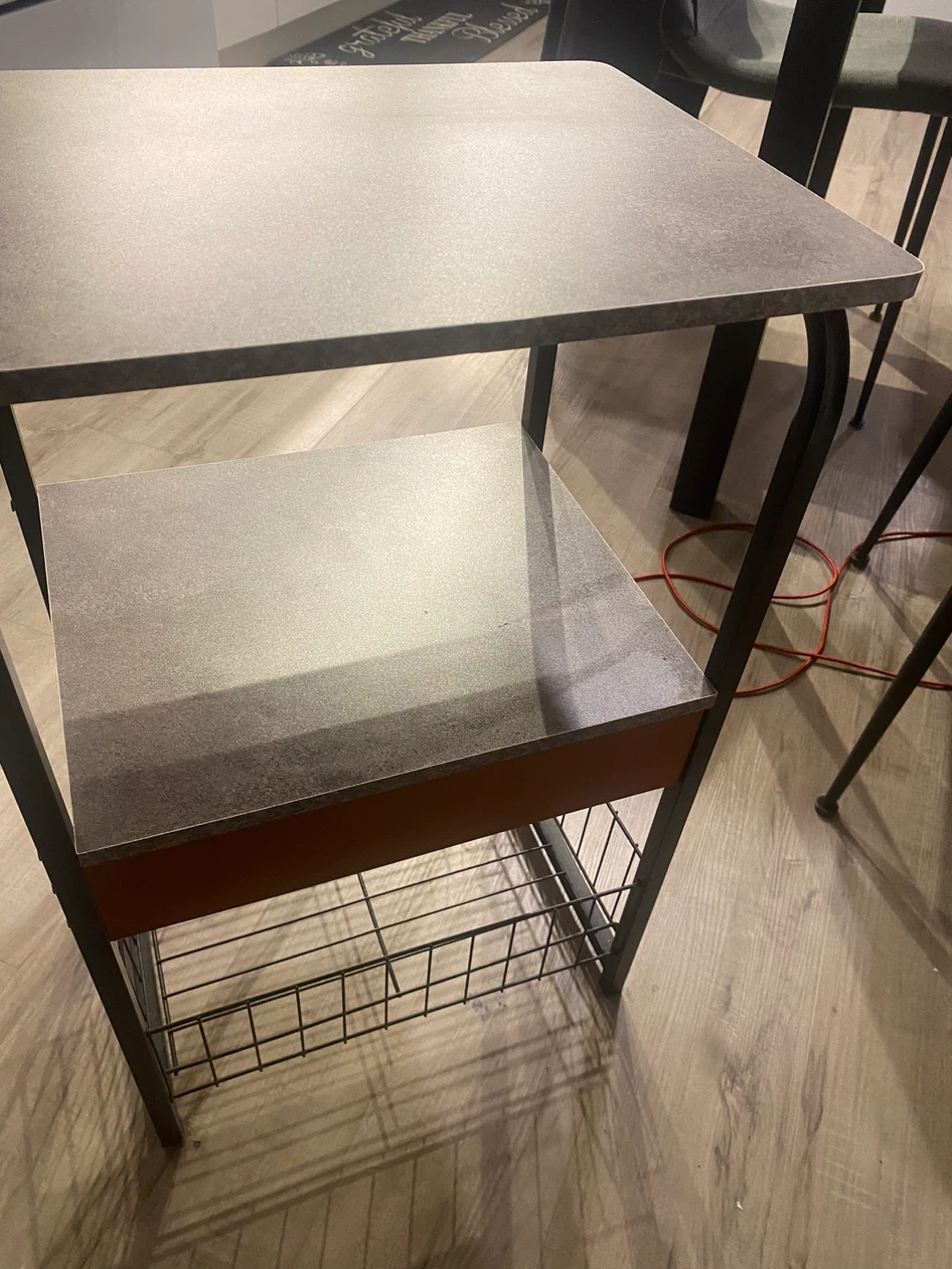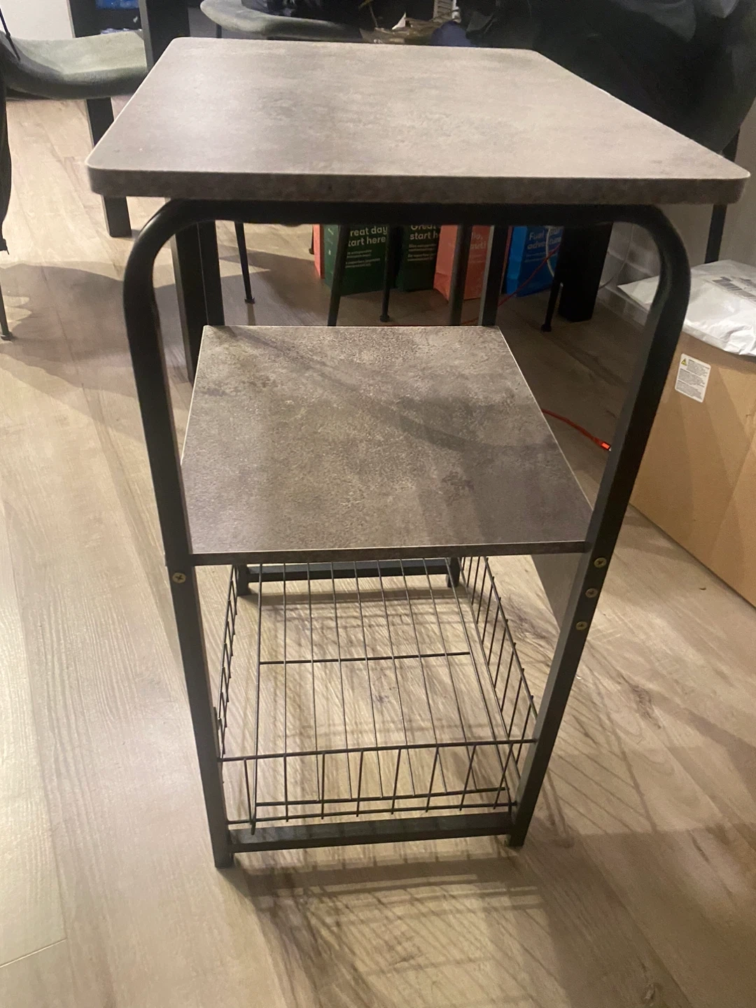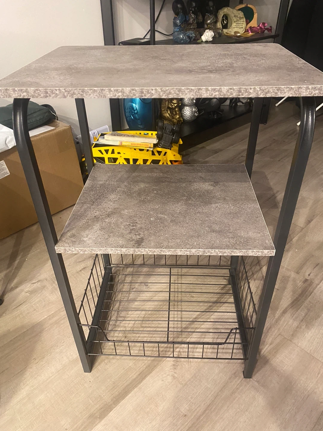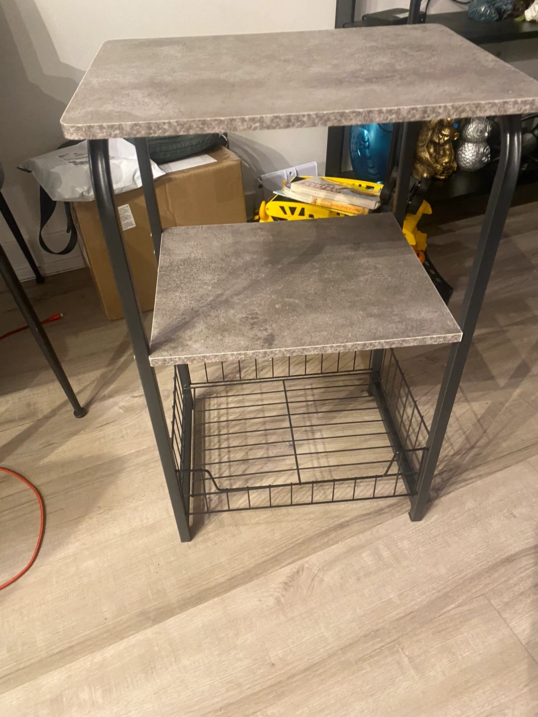 59Selling a handy 3-tier side table! It's perfect for small spaces or as an extra surface in your living room or bedroom. The table has a grey top and two lower shelves, with a metal frame and a wire basket at the bottom for storage. Great for keeping your essentials within reach!