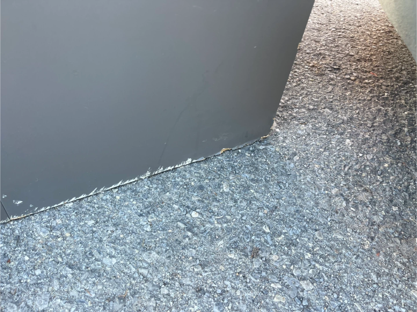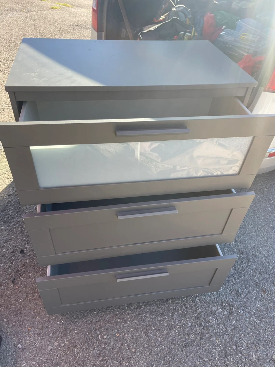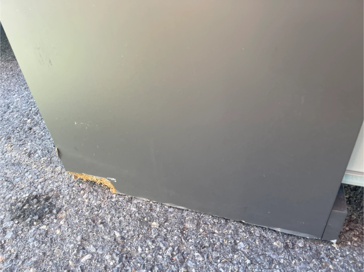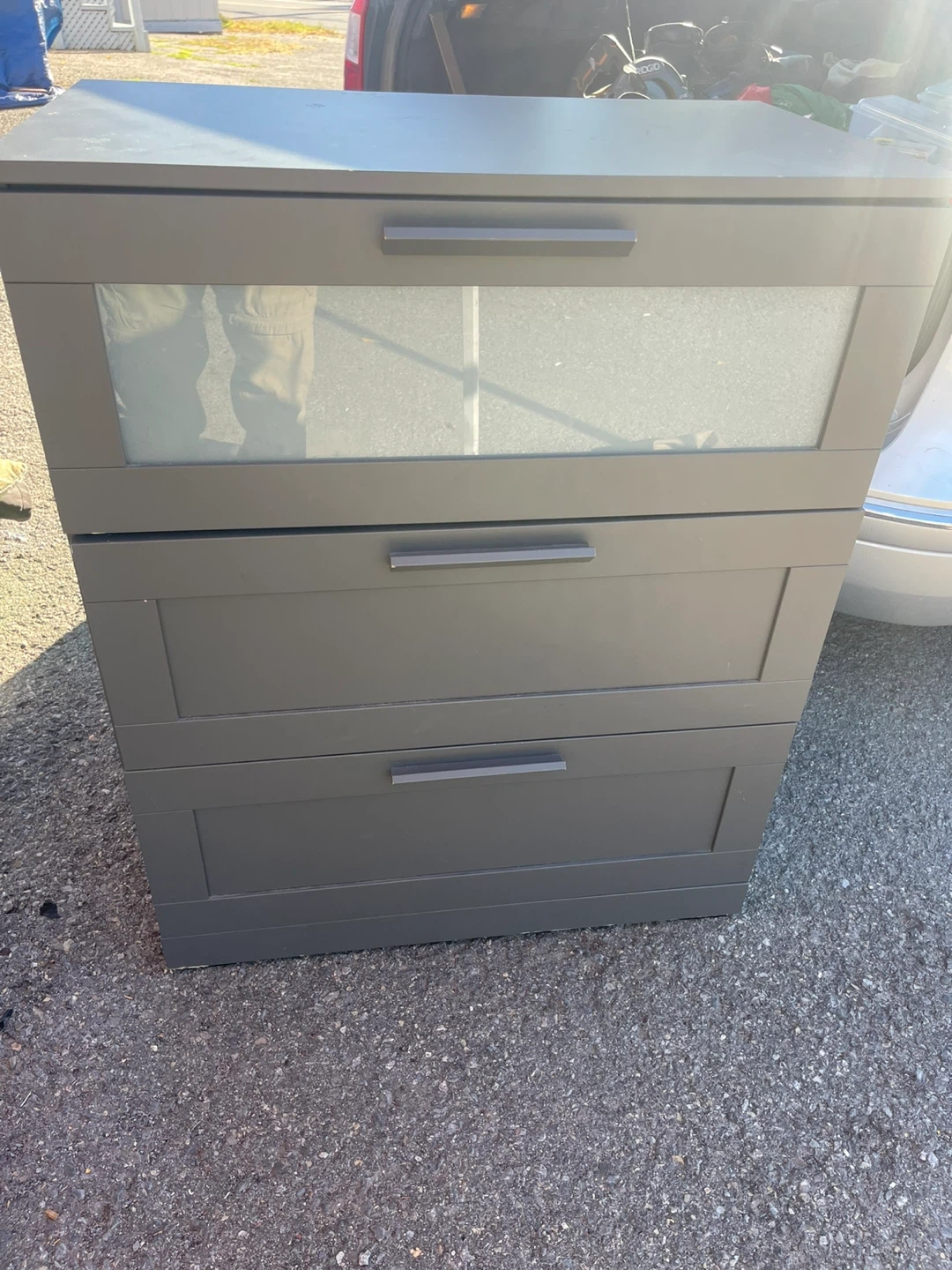 Selling a grey four-drawer dresser. It has some damage on the bottom edges, as shown in the pictures. Still functional and could be a great piece with a little TLC