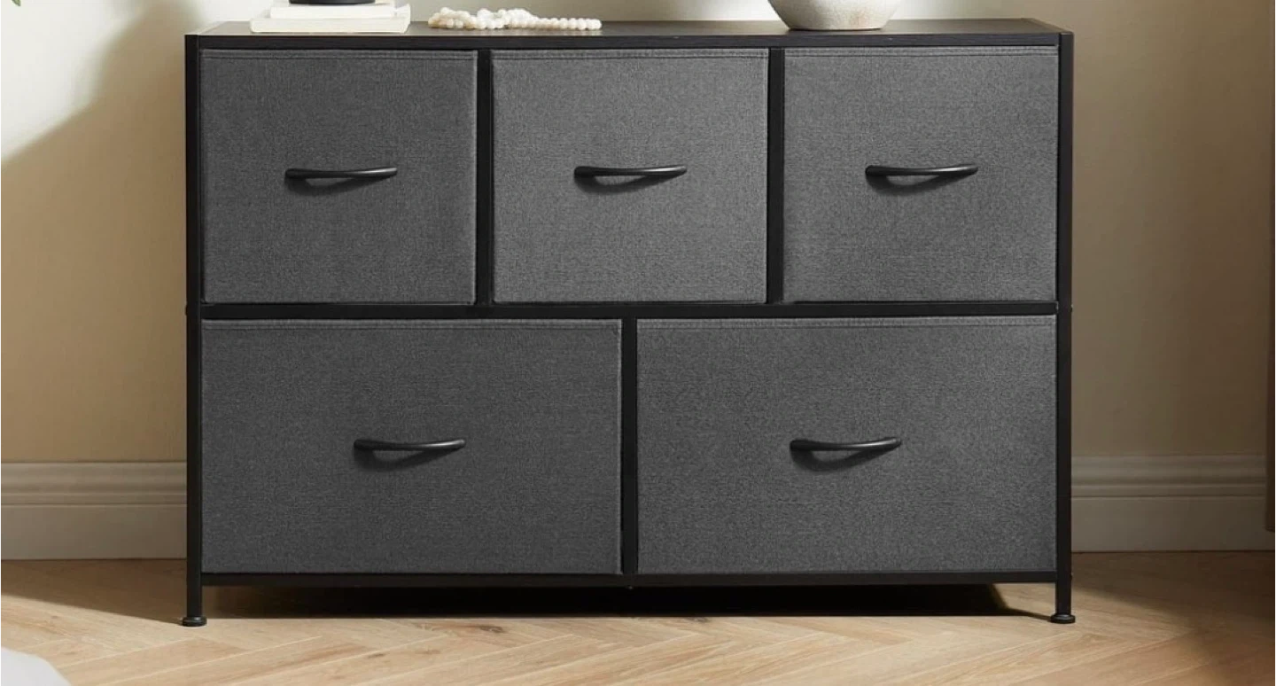 This is a grey dresser with 5 fabric drawers! It's in great condition and would be perfect for adding some extra storage to any room