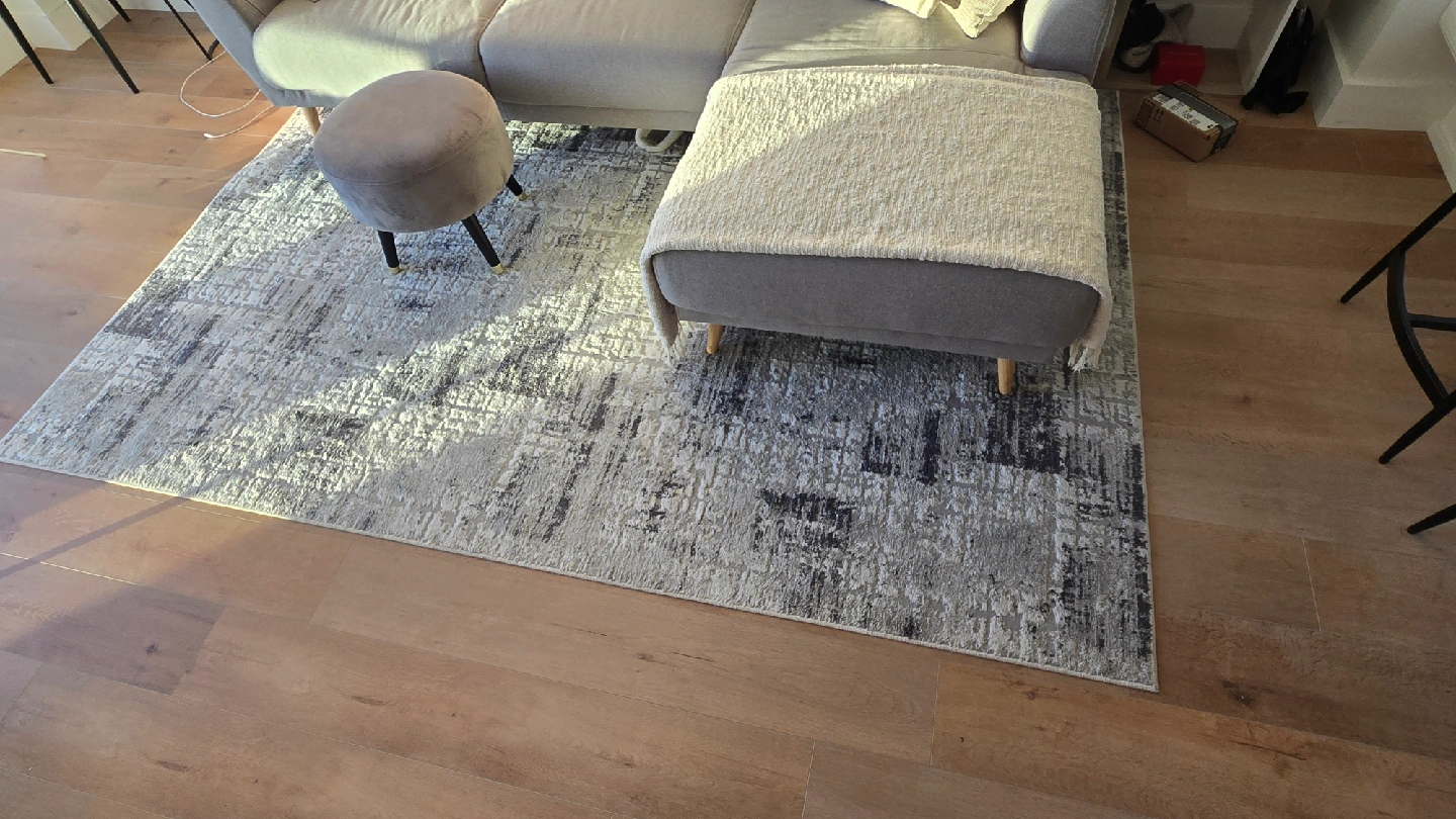 Selling a grey area rug with an abstract pattern. It's in great shape and would look lovely in any living room or bedroom. The rug features a mix of light and dark grey tones, creating a modern and stylish look. 6x9 feet non smoking, no pet home