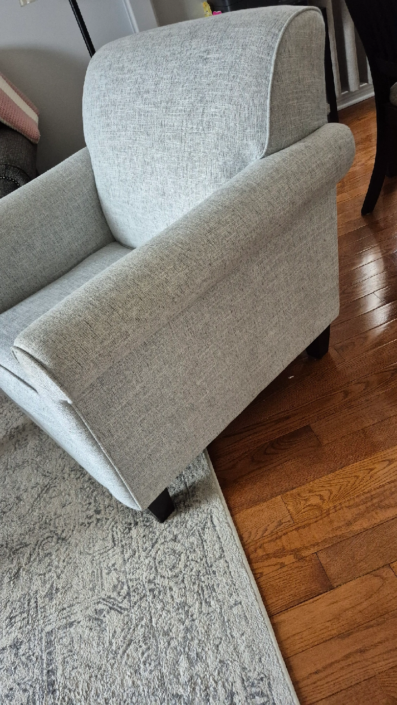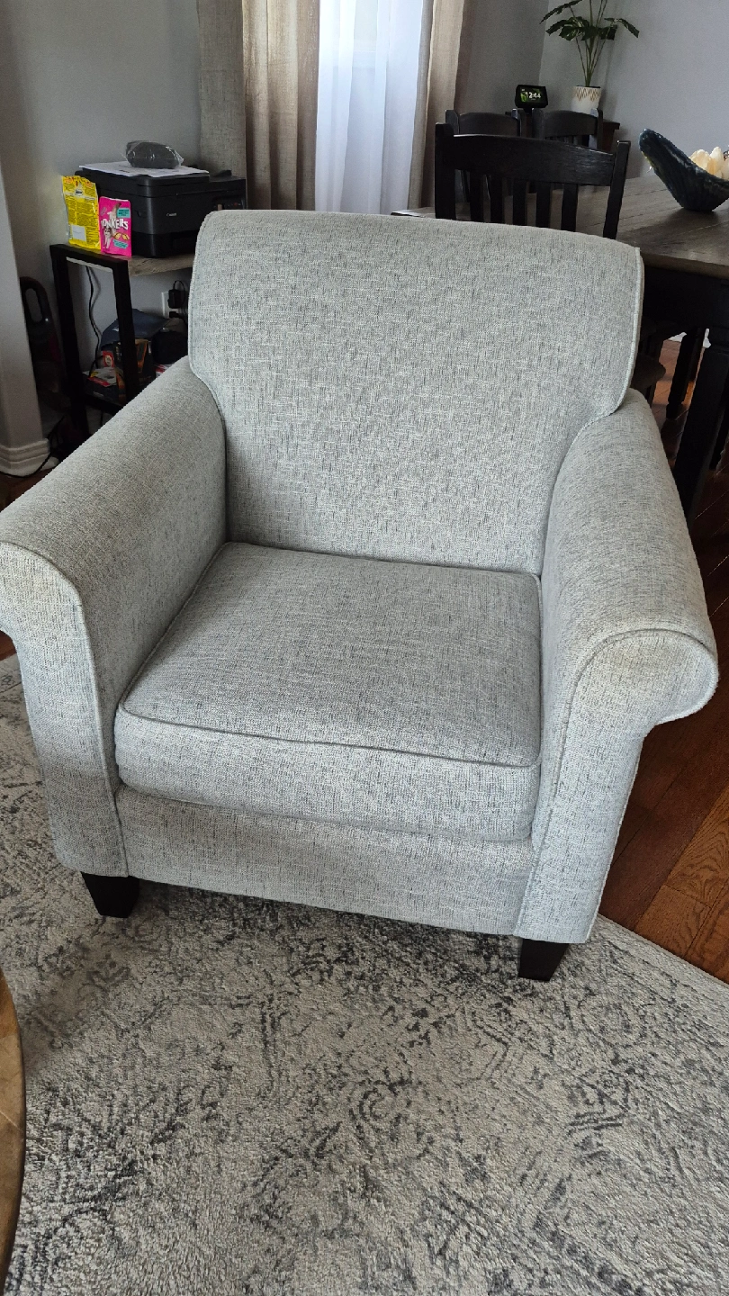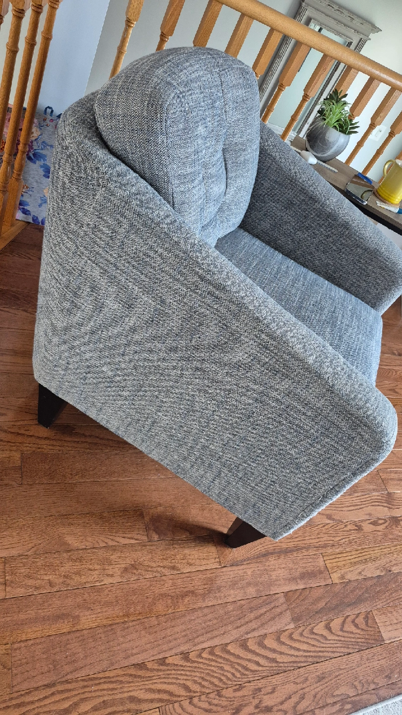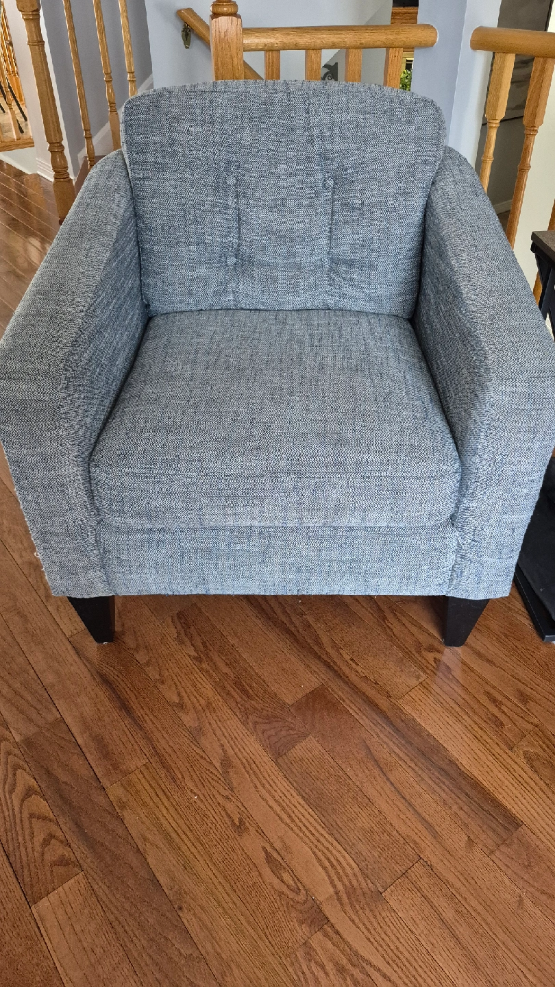 Selling a comfortable grey accent chair. It's in great condition and would be a lovely addition to any living space some pulls on the fabric. bluish Grey is a Layzboy chair. $100 each or both for $150