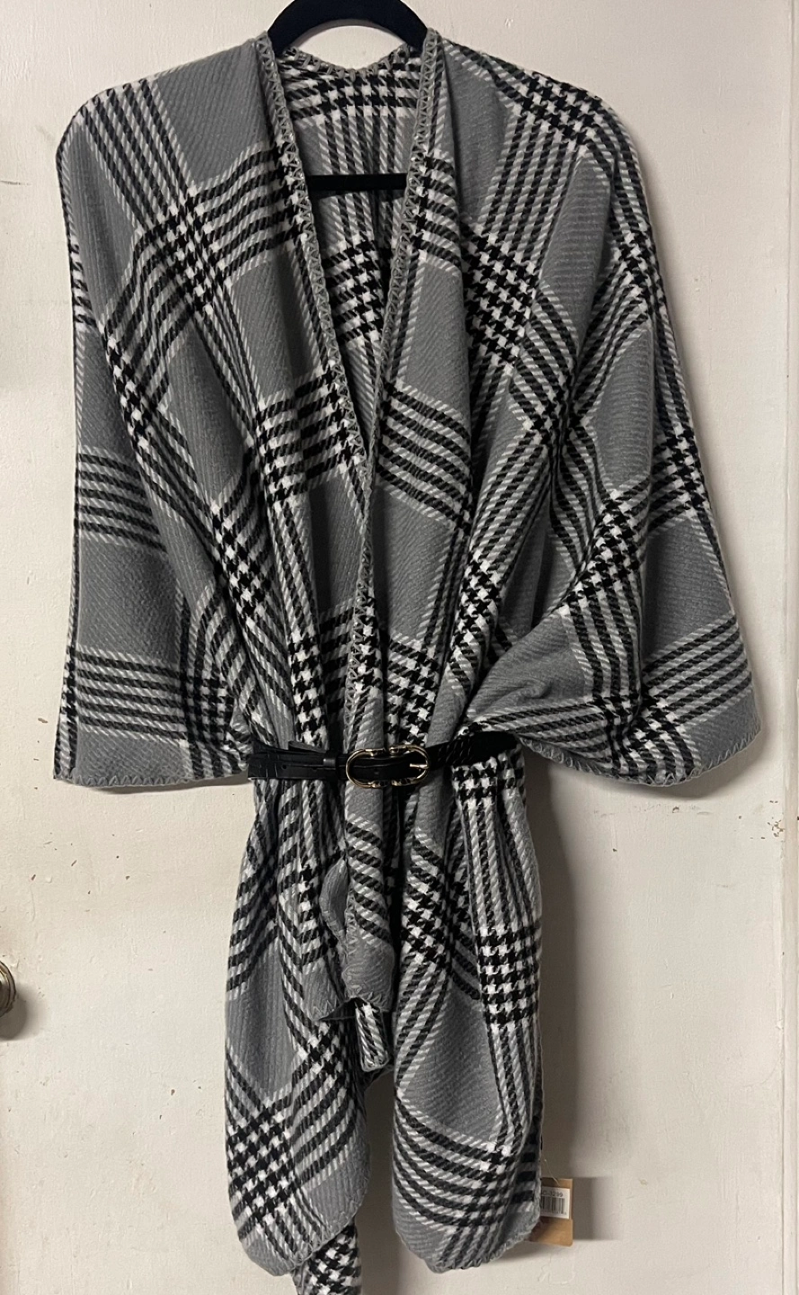 Brand: Just Cozy Item: Grey and black plaid cape. Great for fall and winter. Condition: New with tags. Item Featured in third and fourth picture with A black shirt under and also a belt, to show how you could wear it. BELT & Blouse are not included. If you are interested in this item feel free to message me. Thank you.