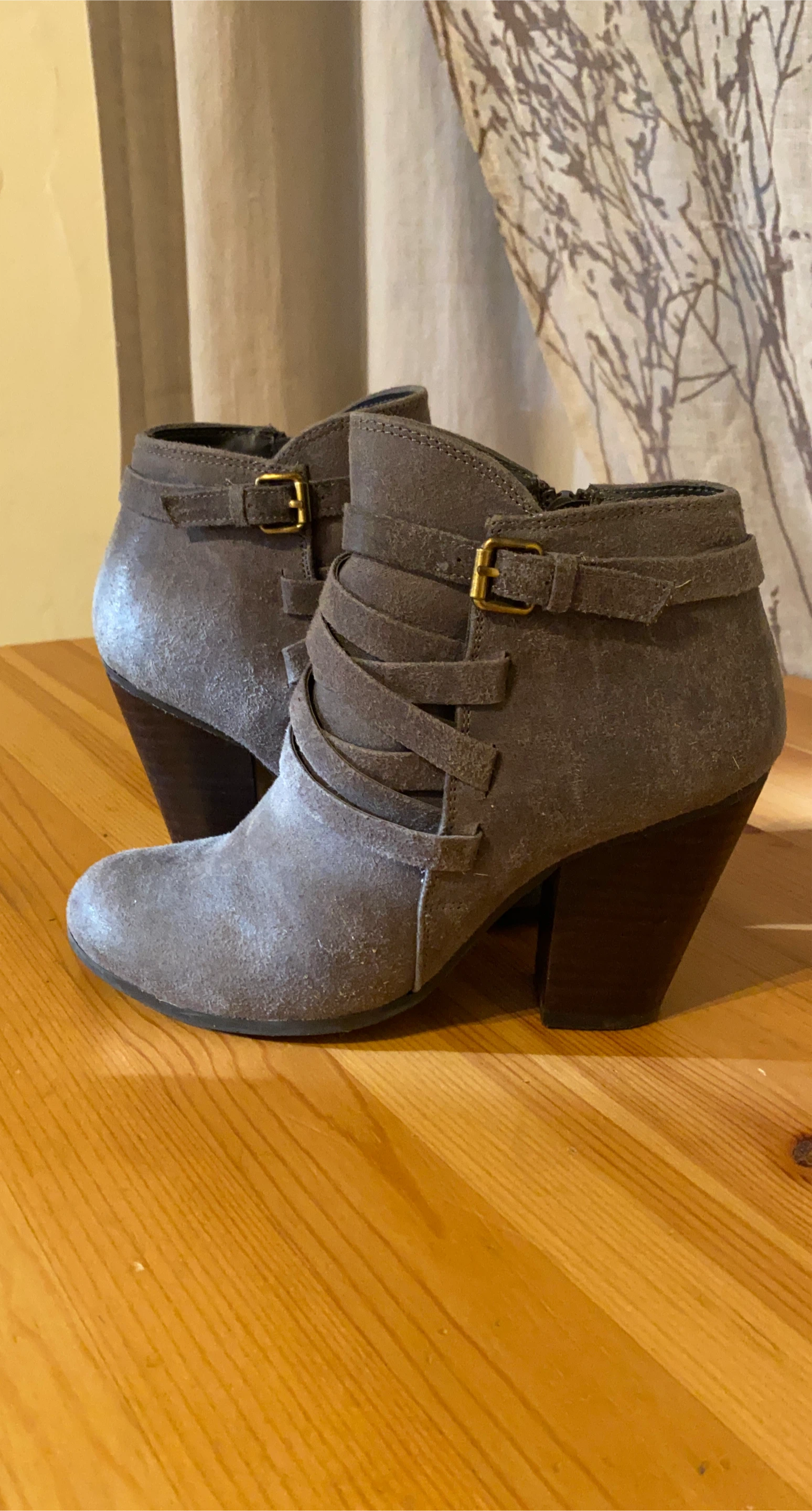 These grey ankle boots feature a stylish design with straps and a comfortable heel height, perfect for adding a touch of flair to any outfit