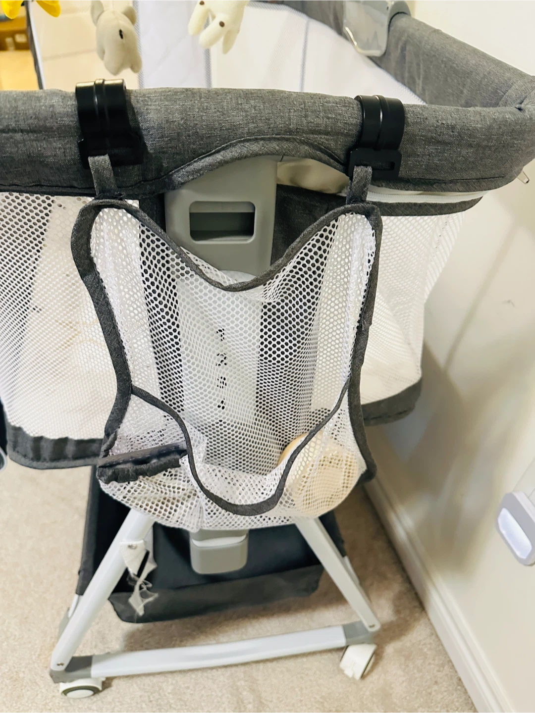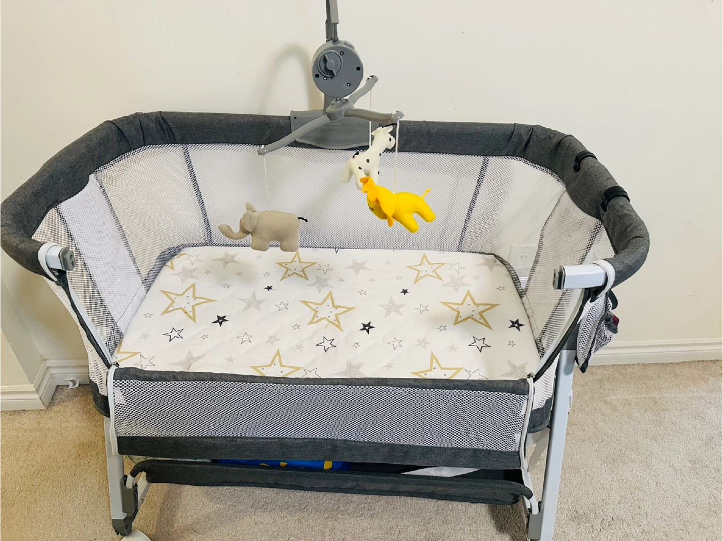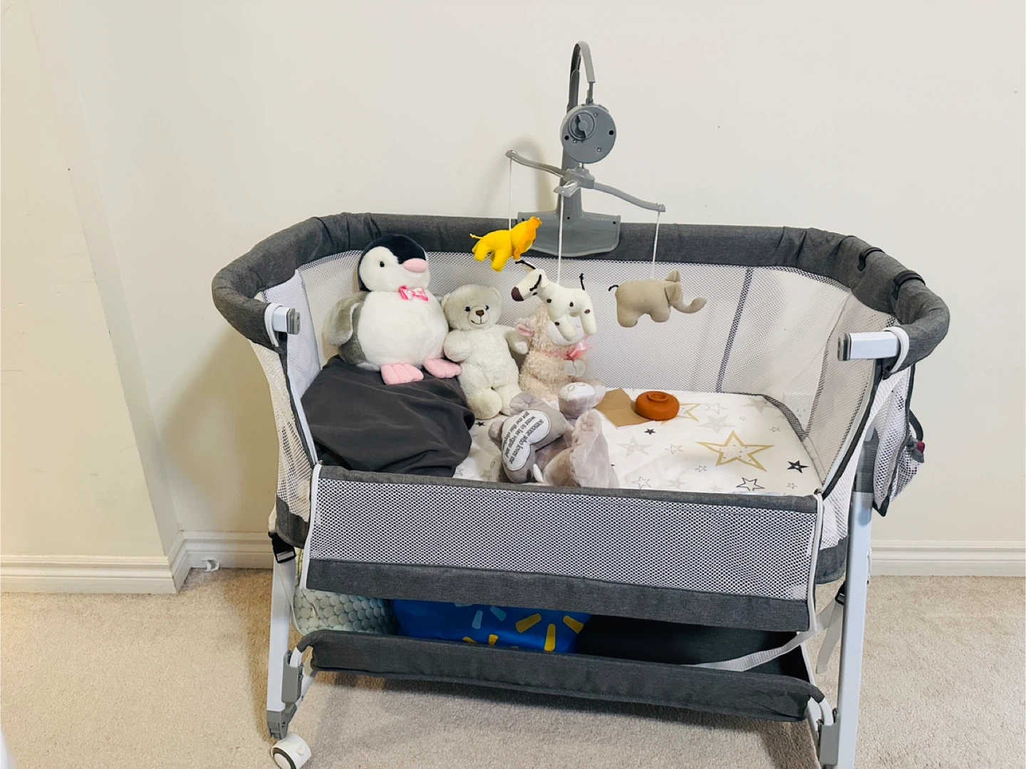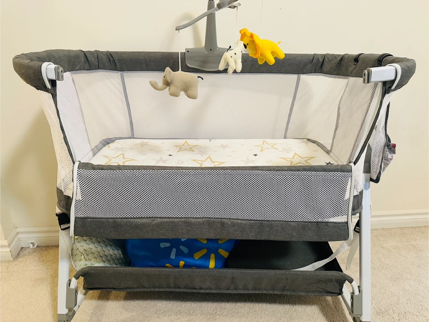 Selling a gently used baby bassinet in great condition! It comes with a cute mobile featuring hanging animal toys to keep your little one entertained. The bassinet is grey and white, with a star-patterned mattress. It also has a handy storage area underneath for diapers, wipes, or extra blankets.