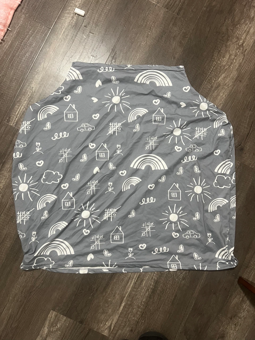 31This is a grey baby car seat canopy cover with a cute pattern of houses, rainbows, suns, and cars. It's in great condition and ready to keep your little one protected from the elements!