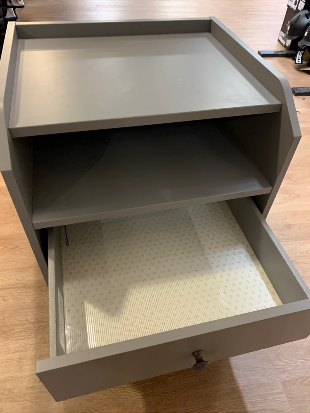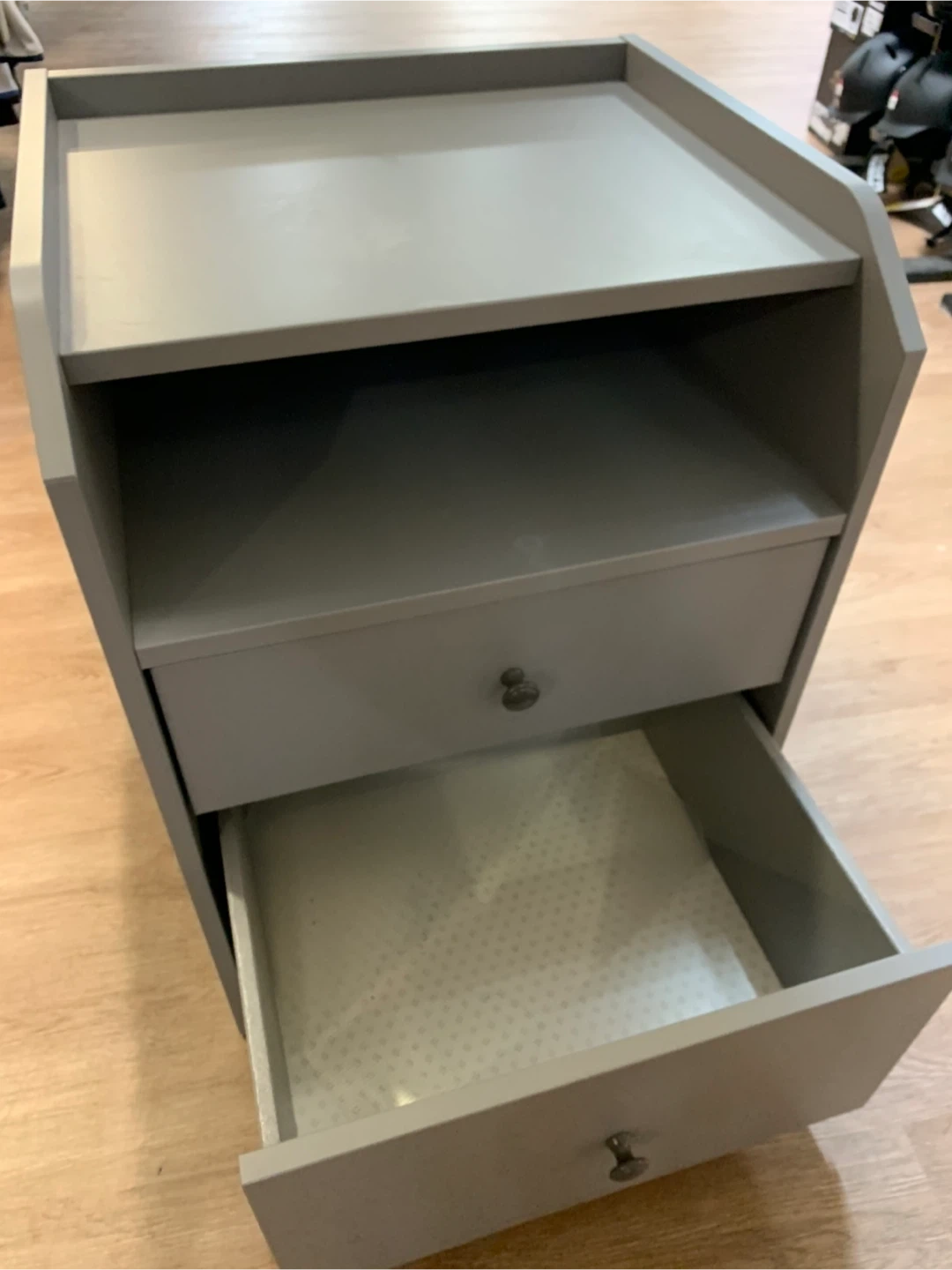 Here's a handy bedside table with a couple of drawers for storage! It's a nice neutral grey colour that would fit in with most decor styles. Perfect for keeping your books, phone, and other nighttime essentials close at hand
