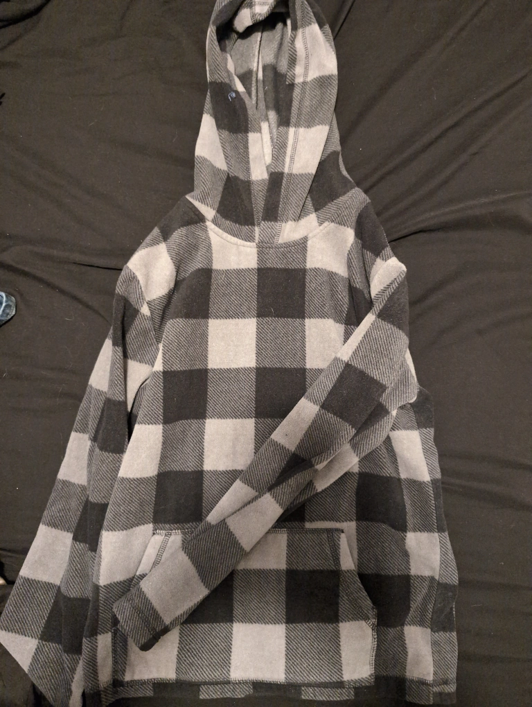 Selling a cozy grey and black plaid hoodie. It's in great condition and perfect for staying warm on chilly days! smoke free home look at my bio. I am selling multiple clothing items for younger boys preteen size. willing to put things in bundles for extremely cheap. just send a message with things that you like and offers