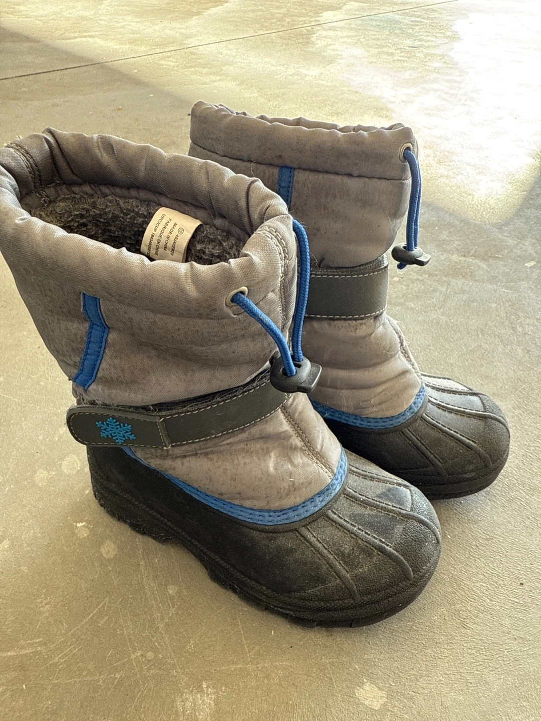 Selling a pair of grey and blue winter snow boots. They're in good condition and ready for some fun in the snow!