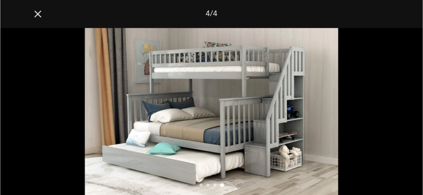 34Selling a bunk bed with a trundle in great condition! It's a stylish and space-saving solution for kids' rooms or guest rooms. The grey colour fits well with any decor, and the trundle provides an extra sleeping space when needed. It's sturdy and safe, perfect for a growing family. The integrated staircase with handrails ensures safe and easy access to the top bunk, while each step includes built-in storage shelves for books, toys, and essentials. Bed sizes are twin, full, twin from top to bottom. Bought at over $1500, selling at $799 only. Already disassembled and well packed.