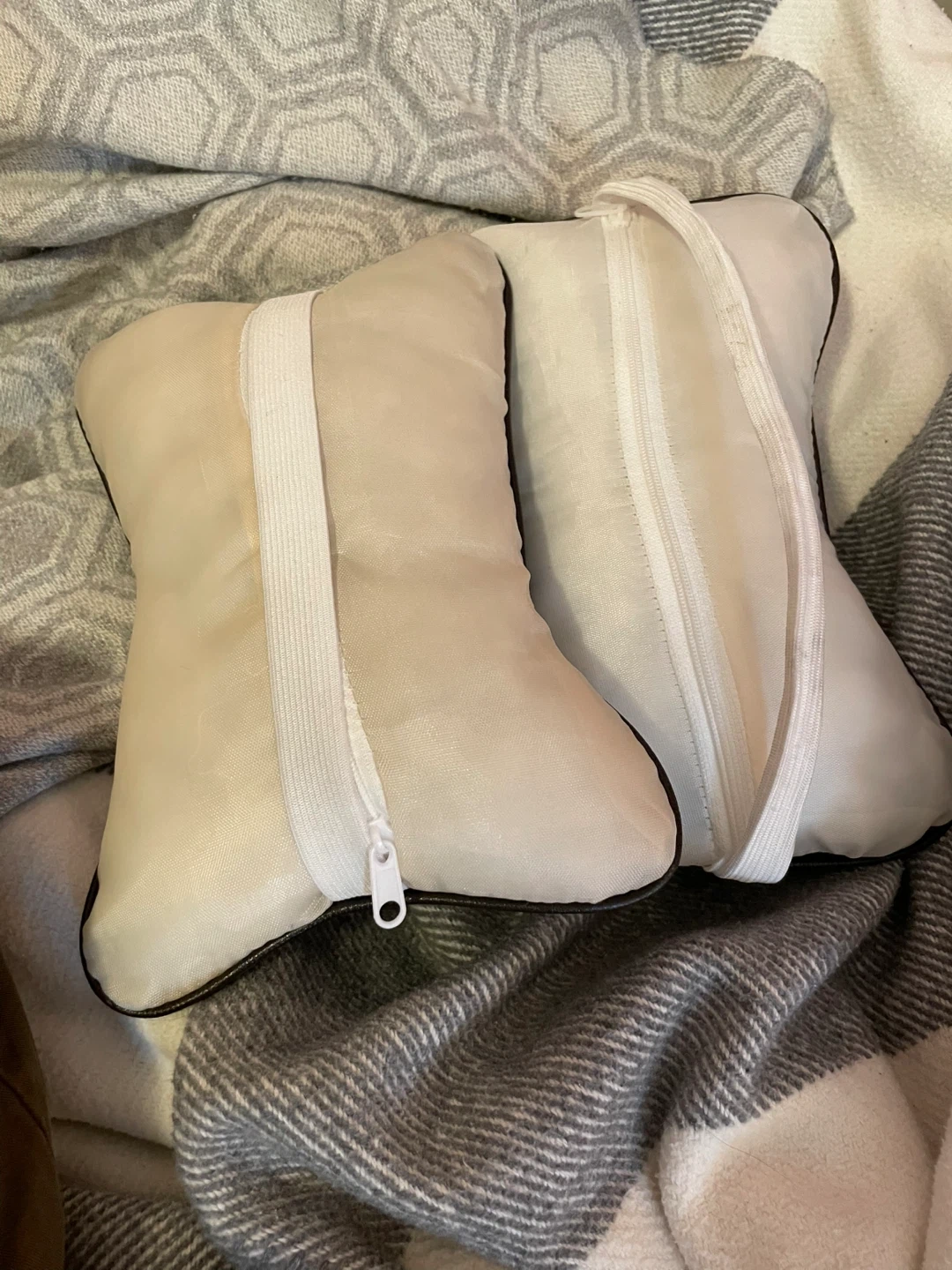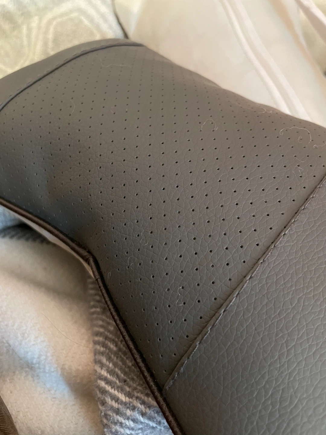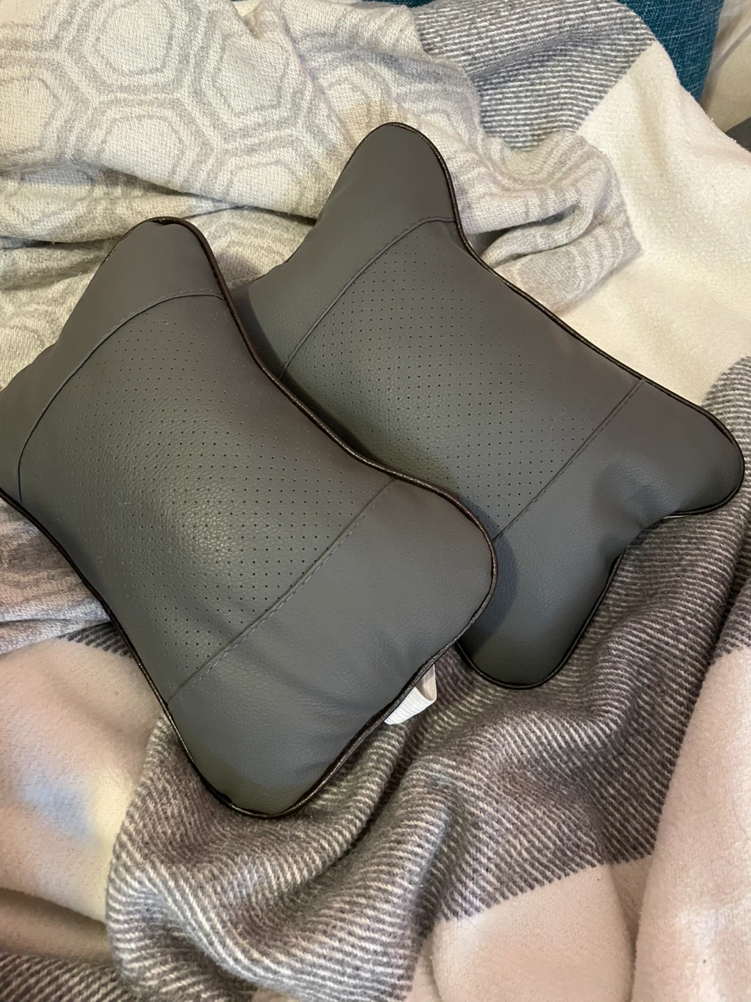 Selling a set of grey car headrest pillows! They're in great condition (minus the back of one wear the band is a bit loose). The pillows have a unique shape and a perforated design on the front. They’re barely used because they didn’t fit on my seats (which is why the one was stretched to try to fit!)