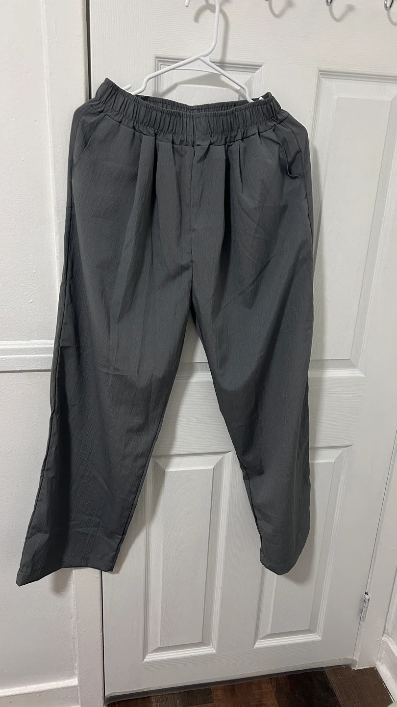 Selling a comfy pair of grey casual pants. They have an elastic waistband for a flexible fit and a relaxed style. Perfect for everyday wear!