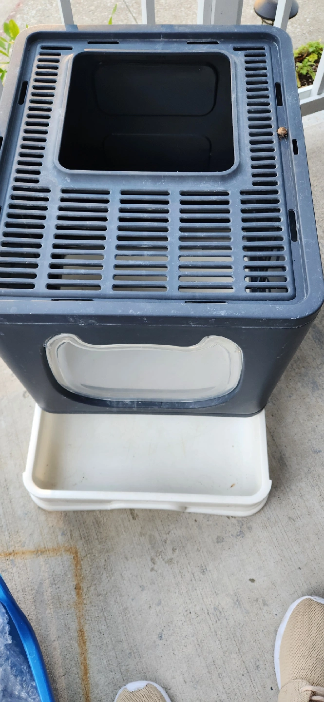 10Selling a cat litter box enclosure in grey. It's in great condition and ready for a new home for your furry friend! It features a unique design with a cat-shaped entrance.