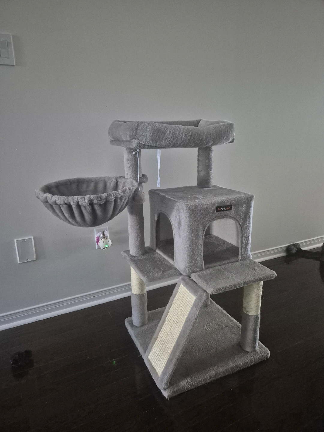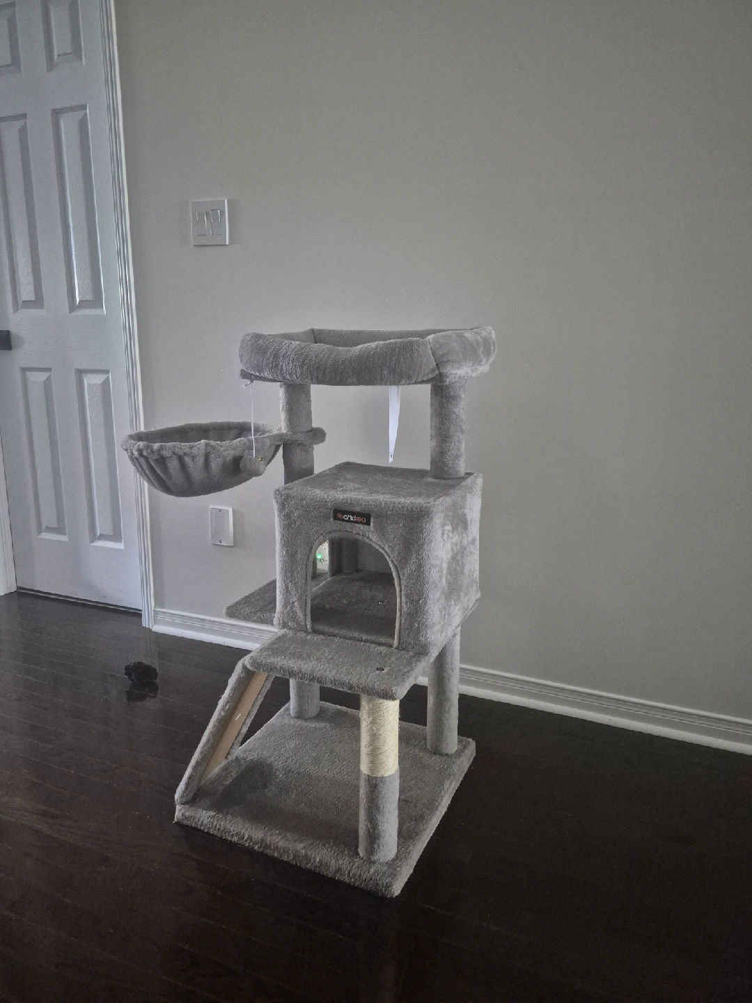 10Selling a cat tree in great condition! It's a nice grey colour and has a few levels for your cat to explore. There's a cozy little house, a comfy basket, and some scratching posts too. Perfect for keeping your furry friend entertained!