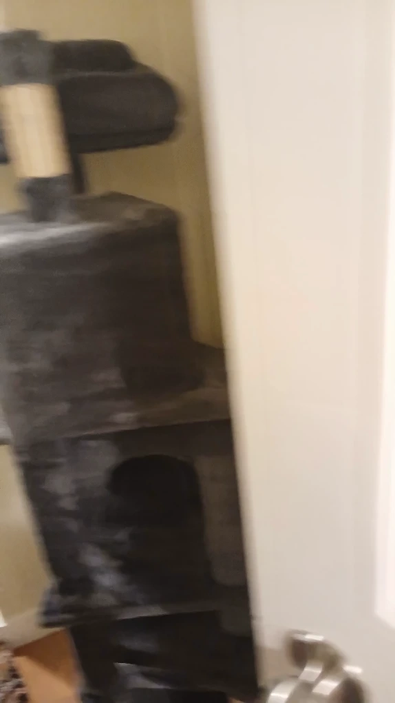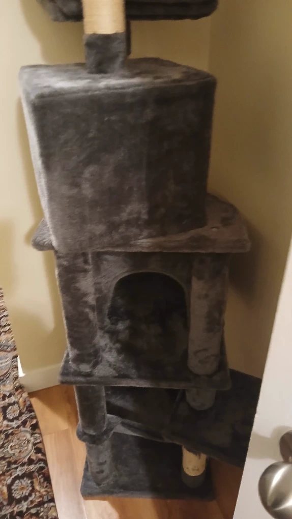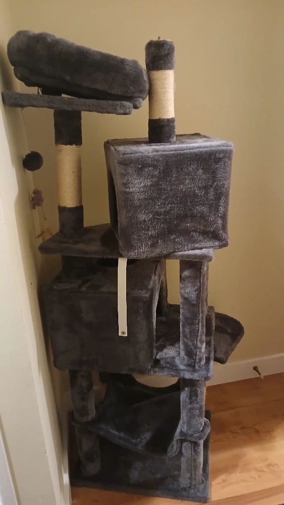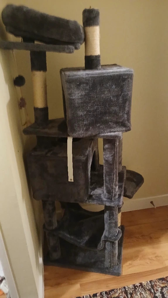 135Selling a cat tree in grey. It has multiple levels for your cat to explore and play on. There's a little house, platforms, and scratching posts. It's in good condition!