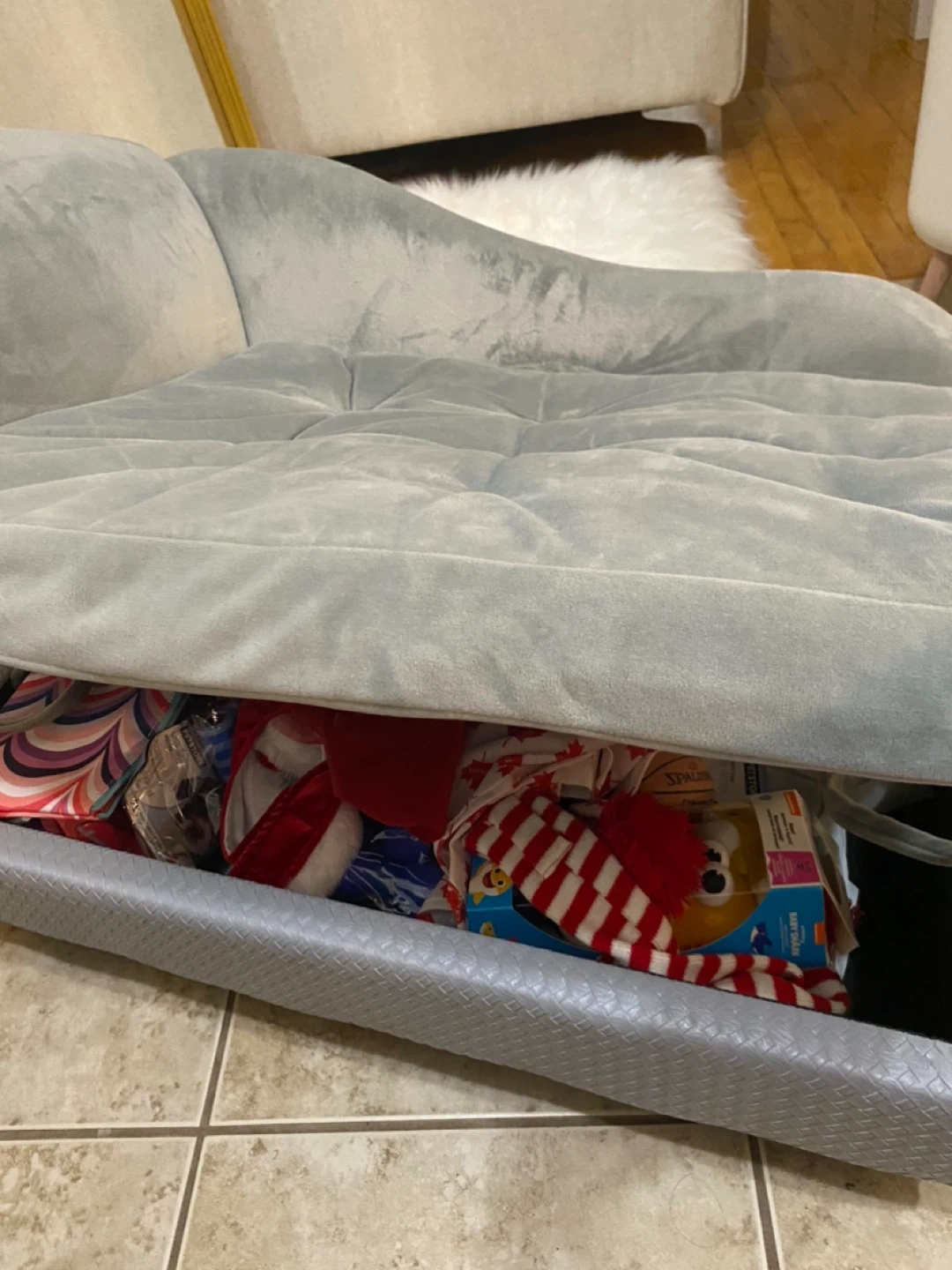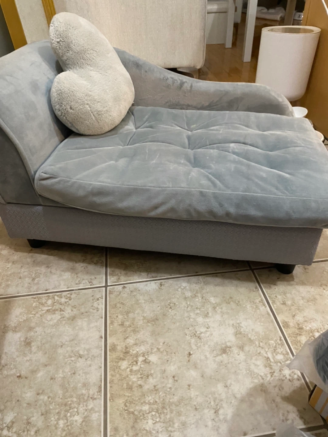 10Selling a lovely grey chaise lounge for pet , It's in great condition and would be a stylish addition to any room. Plus, it has a handy storage compartment underneath for blankets, pillows, or anything else you want to keep tucked away. It's super comfy for lounging and relaxing