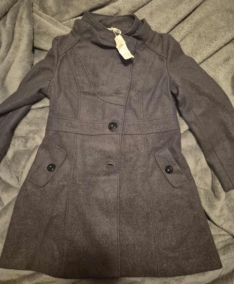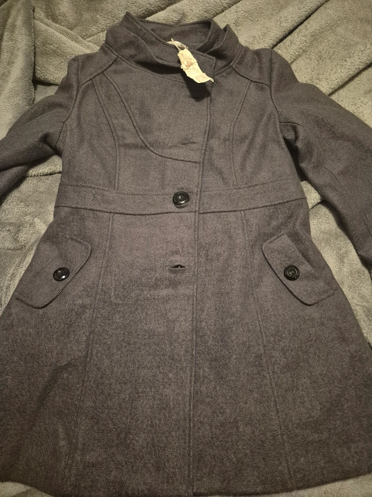 Here's a gently brand new grey coat! It has a stylish design with button closures and pockets. Perfect for cooler weather!