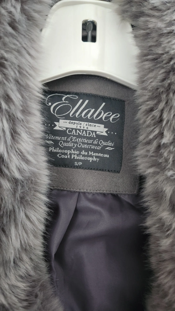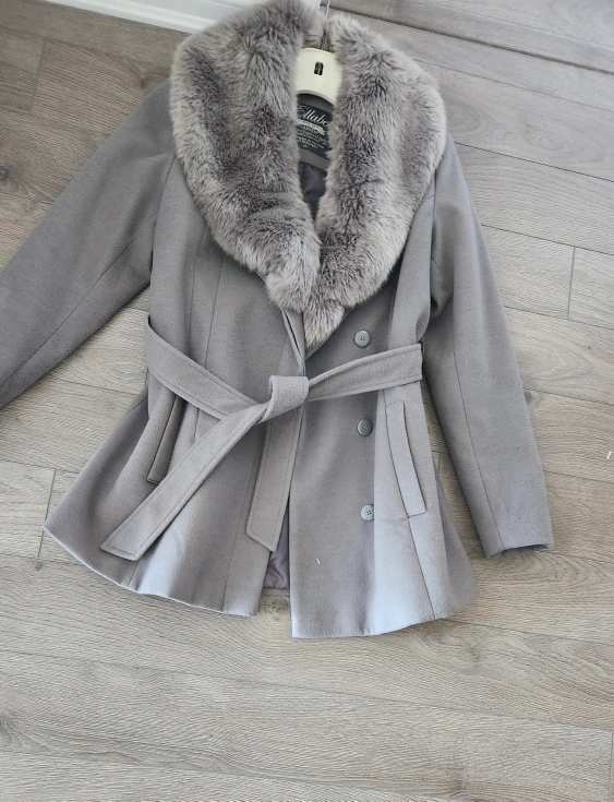 Selling a lovely coat! It's a beautiful grey colour and size S/P. The coat features a faux fur collar and a tie waist. It's in great condition and ready for a new home