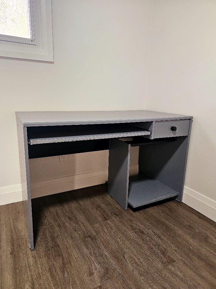 computer desk. Features a pull-out keyboard tray and one drawer. Good for home office or student. Simple design.