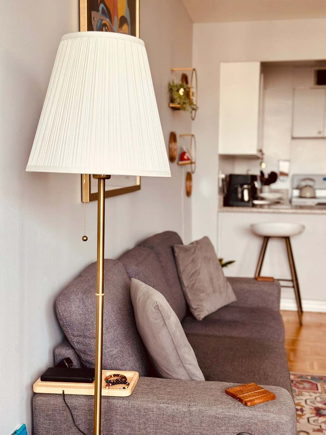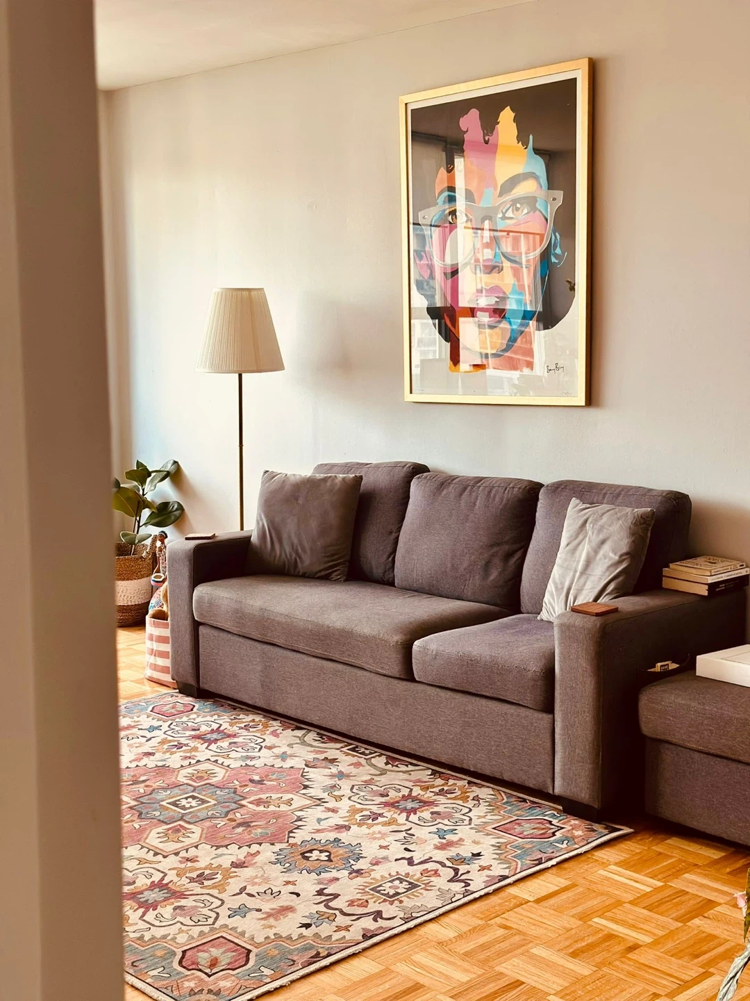 Couch and ottoman combo. Grey fabric. Three back cushions. Comes with an ottoman. A great place to relax after a long day, it comes with an insert to charge phones in one of the sides. Gently used. Just received a deep clean and it’s ready to a new home :)
