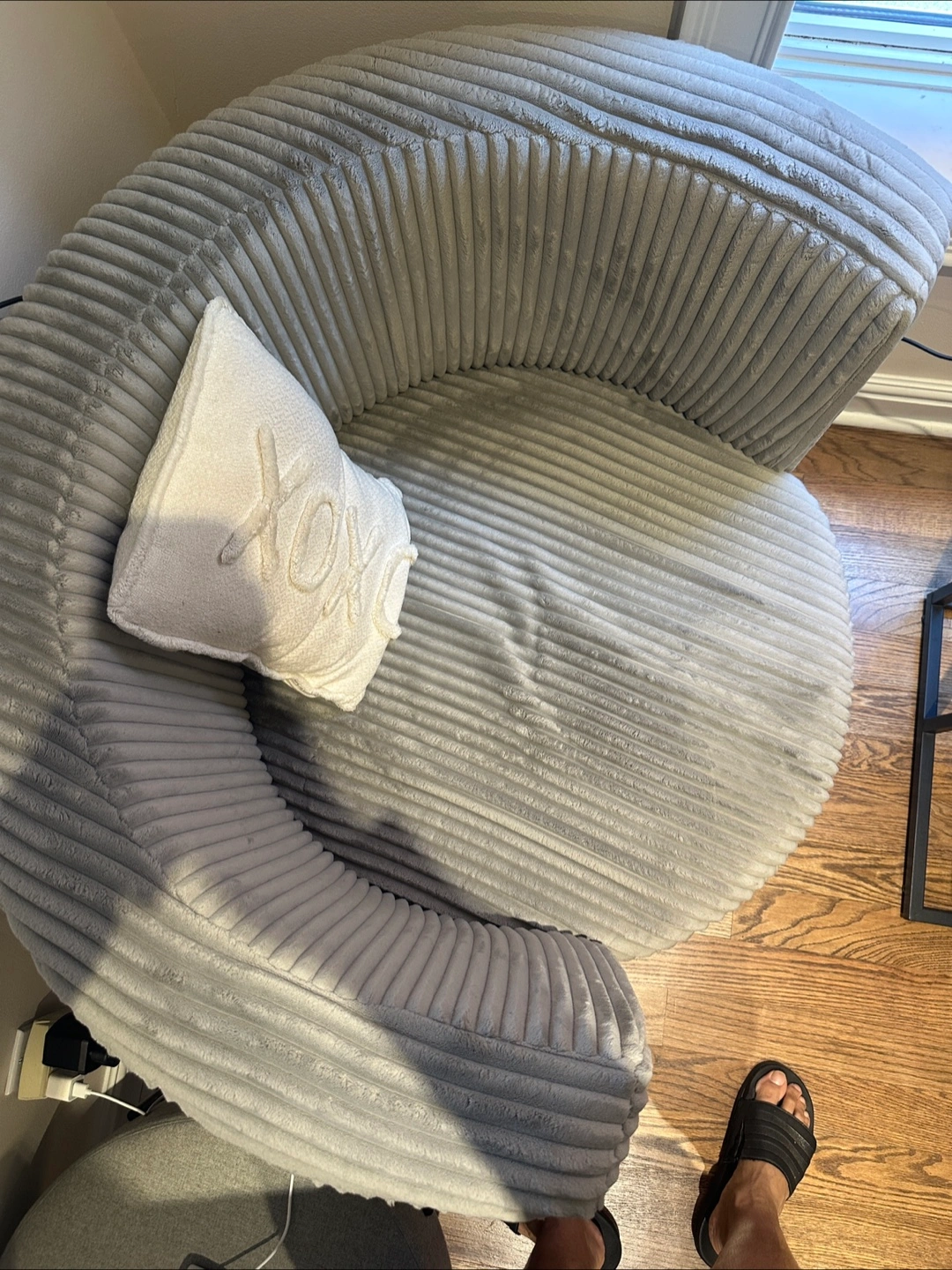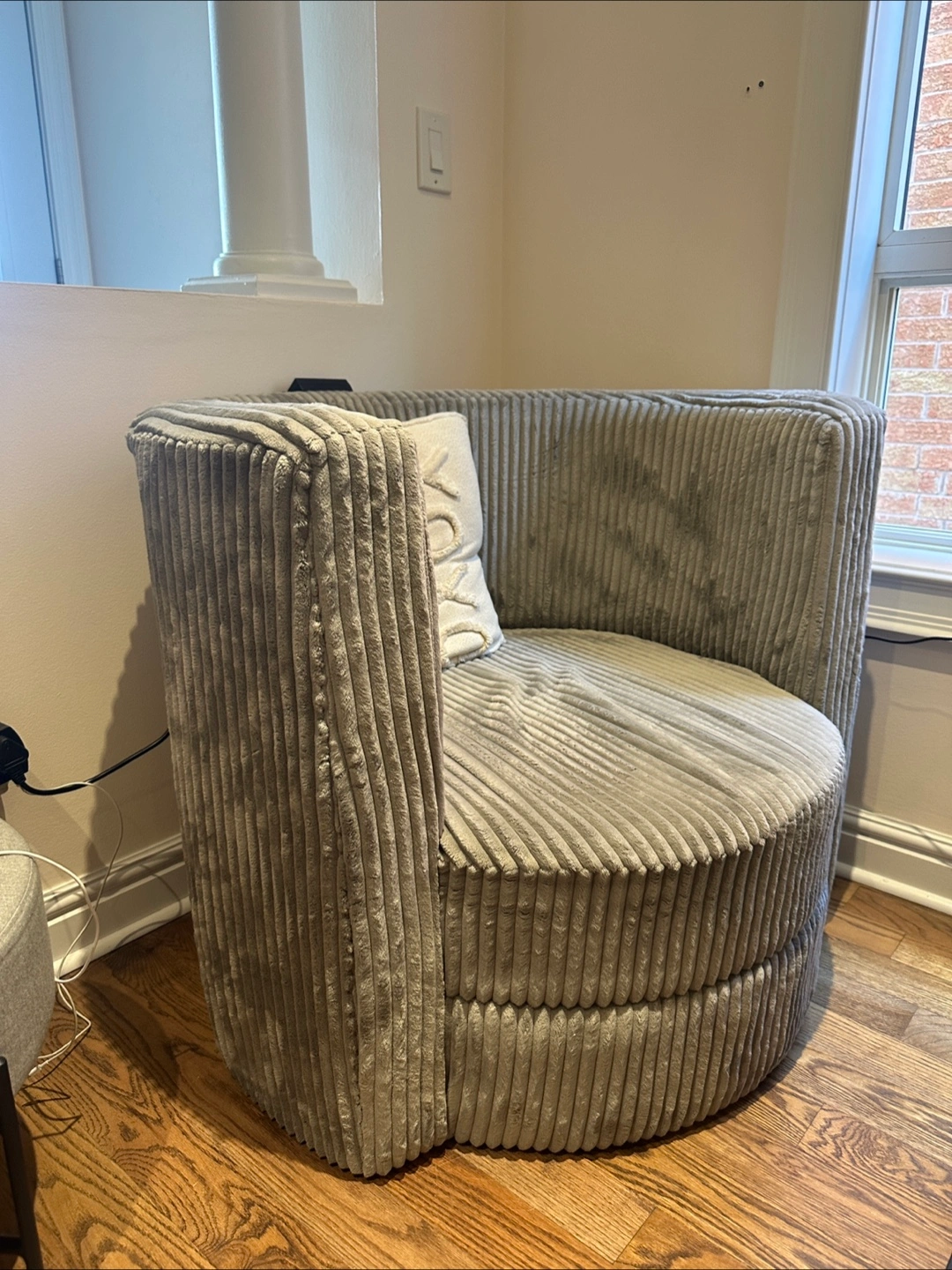H 31 D 34 W 36 Selling a comfy grey corduroy swivel barrel chair! It's in great shape and perfect for a cozy reading nook or living room. The swivel feature makes it super convenient, and the corduroy fabric adds a nice texture to any space
