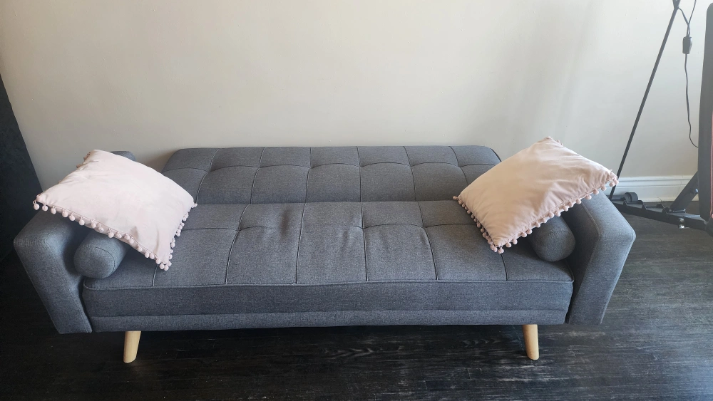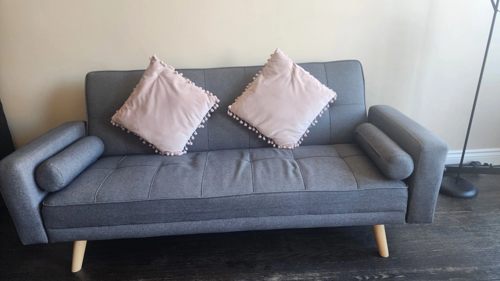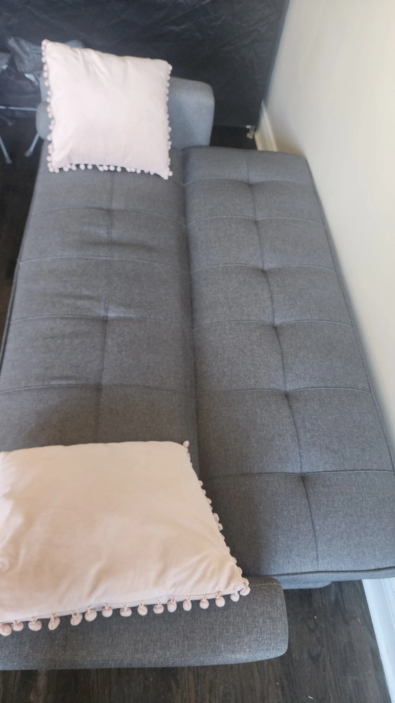 53Grey futon couch with wooden legs. Comes with two pink pillows and two grey pillows. In good condition. Pick Up Only. Must go by Dec 20. Please check other listings. Price negotiatiable if buying several items.