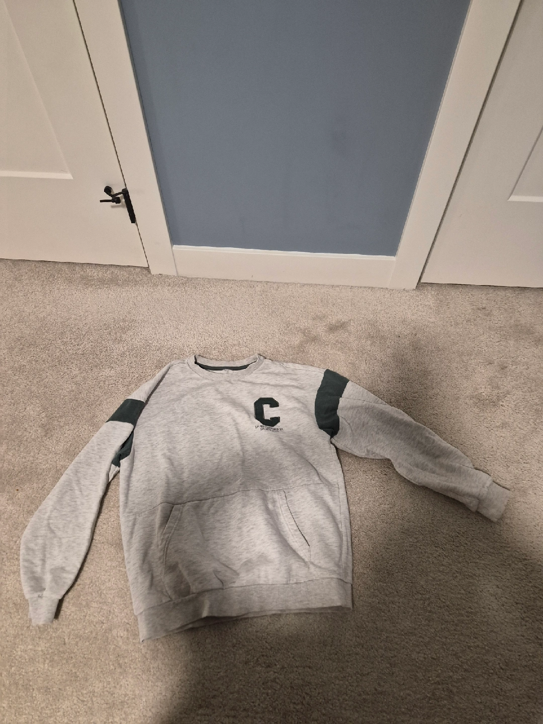 Selling a comfy grey crewneck sweatshirt. It features a 'C' design on the front and has a handy pocket. Perfect for casual wear!