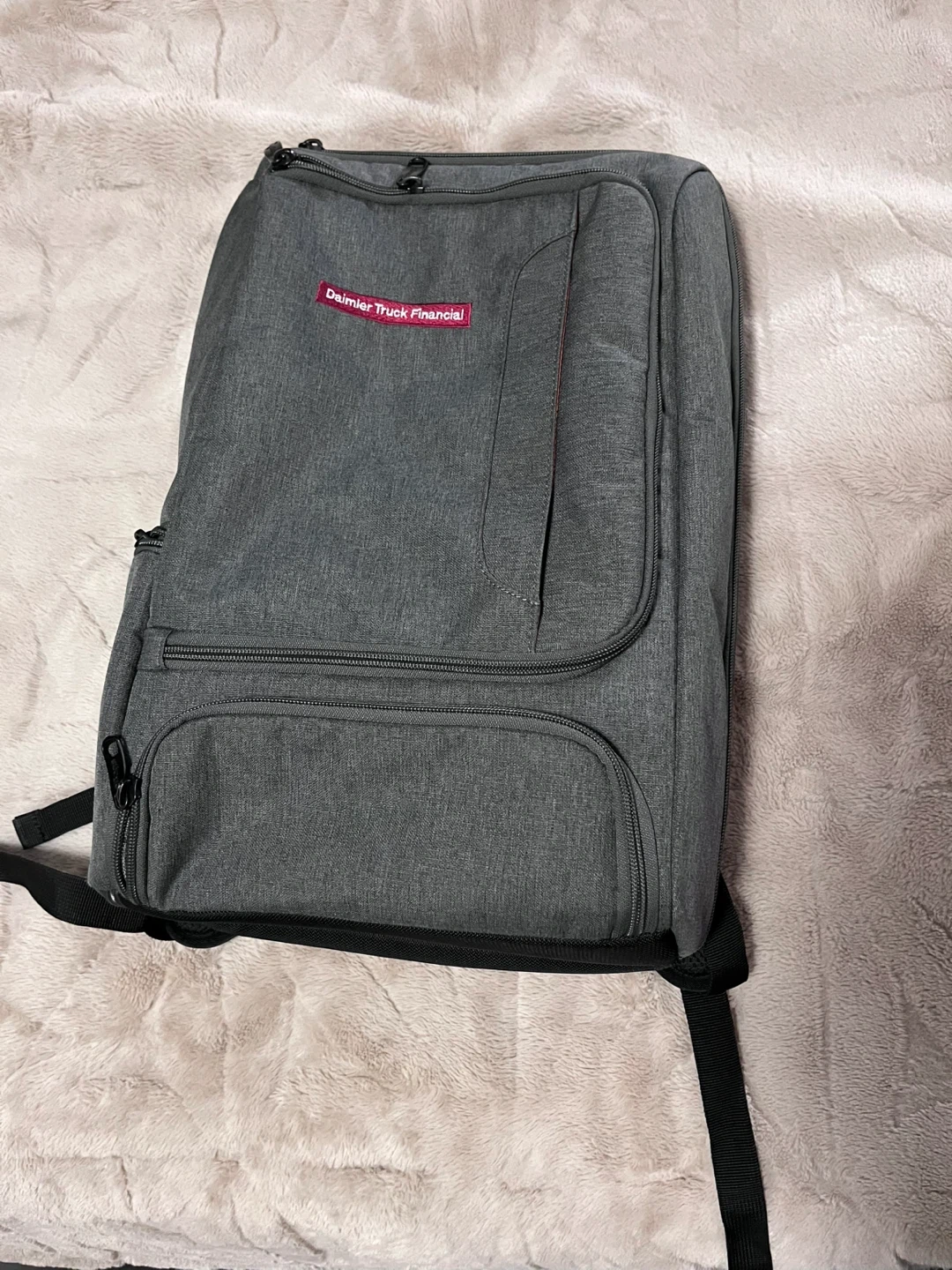 121I'm selling a brand new grey Daimler Truck Financial backpack. It features a spacious interior with multiple compartments and pockets, perfect for organizing. Special laptop cushy compartment and a perfect front pouch for your chargers. The interior is lined with a bright orange fabric. The backpack has adjustable straps and a cushy comfortable fit. Retail value is $45. Selling for $20. If the ad is up then it’s available.