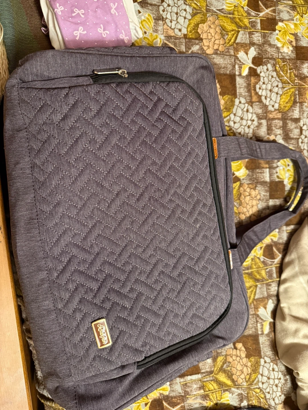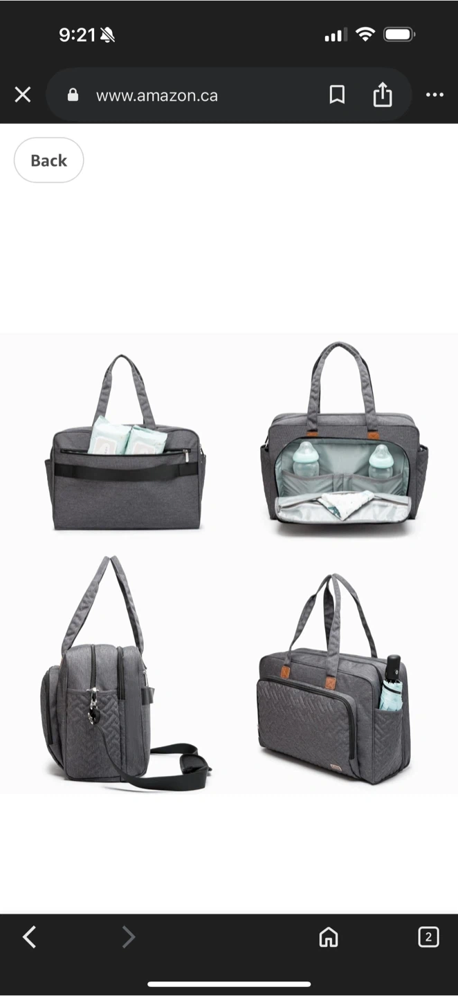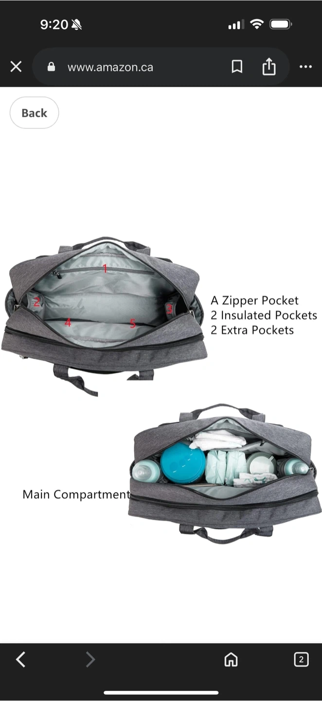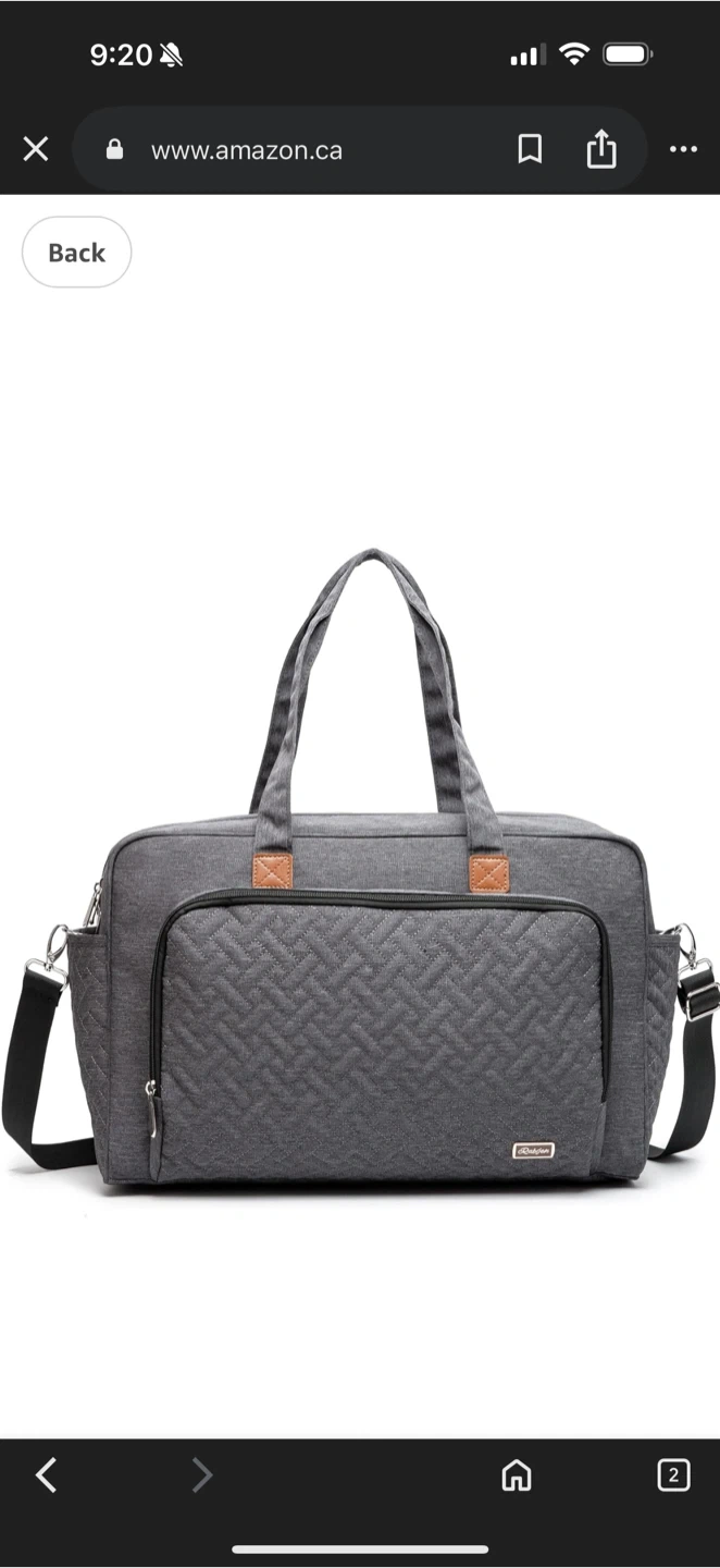 14Check out this diaper bag! It's a stylish grey colour and has tons of room for all your baby essentials. It features: - 4 pockets - 2 pen slots - iPad pocket - Padded pocket for 15.6" devices - Second compartment for extra stuff It's also water-resistant and has quality zippers and metallic ring clips. The dimensions are approximately 17.5" x 12.5" x 8.25" Pick up near to regent freshco