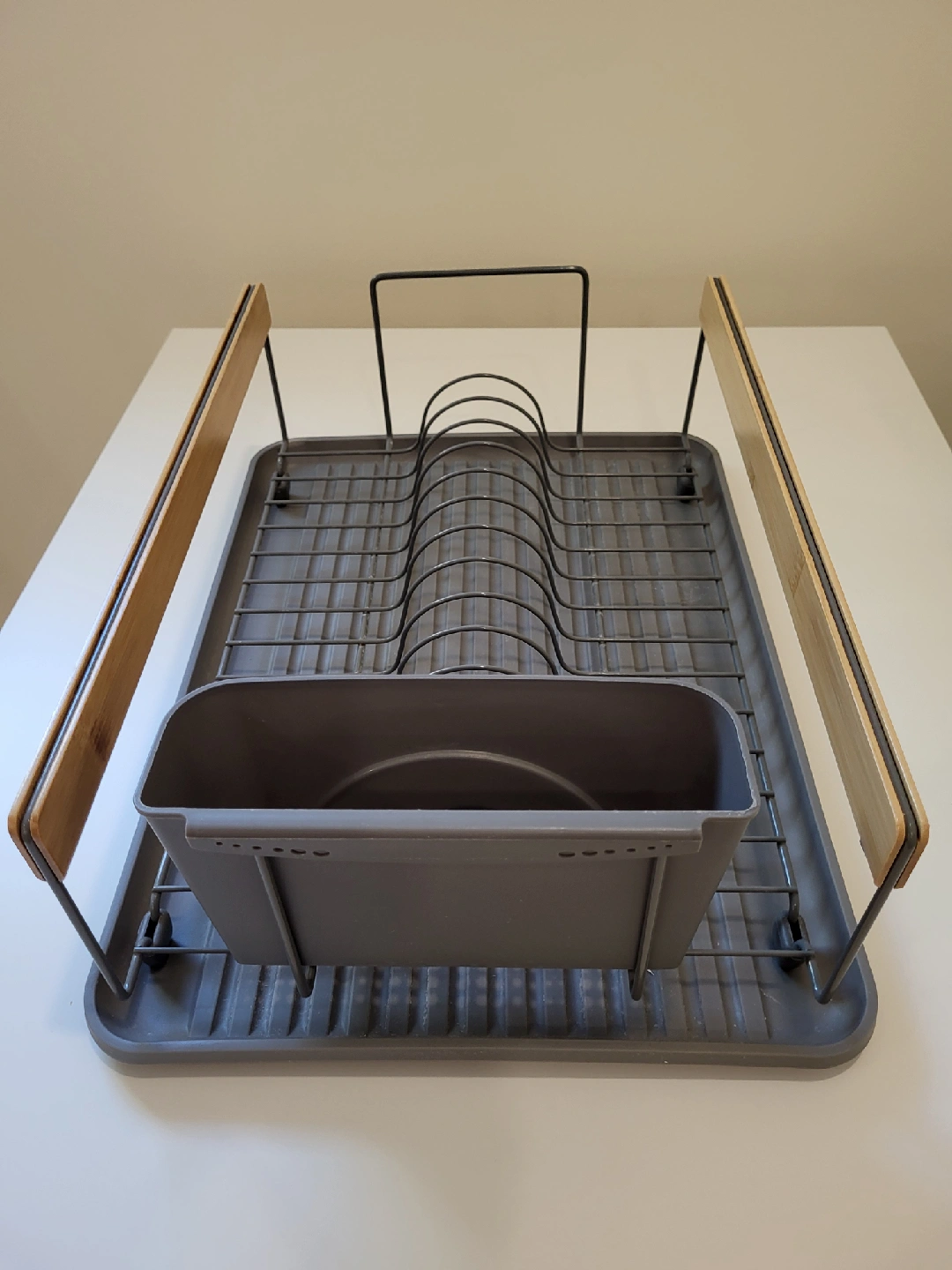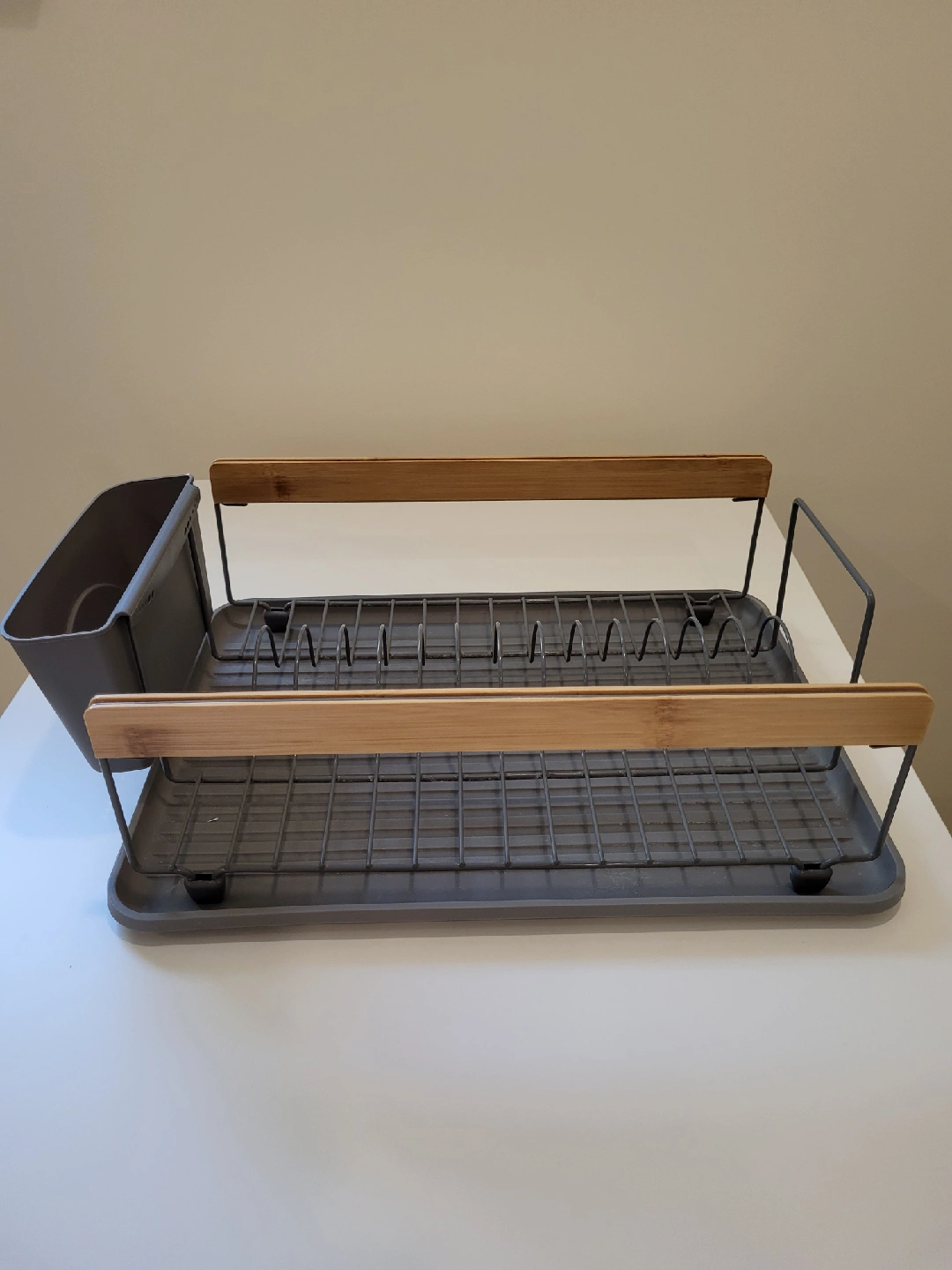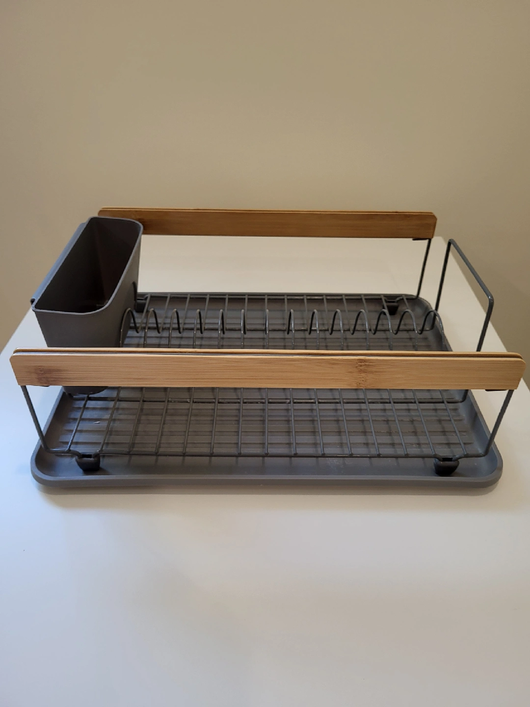 This metal dish rack is perfect for keeping your kitchen organized! It features a grey finish with stylish bamboo accents. It includes a plastic tray for catching water and a utensil holder. It's in great shape and ready for a new home!