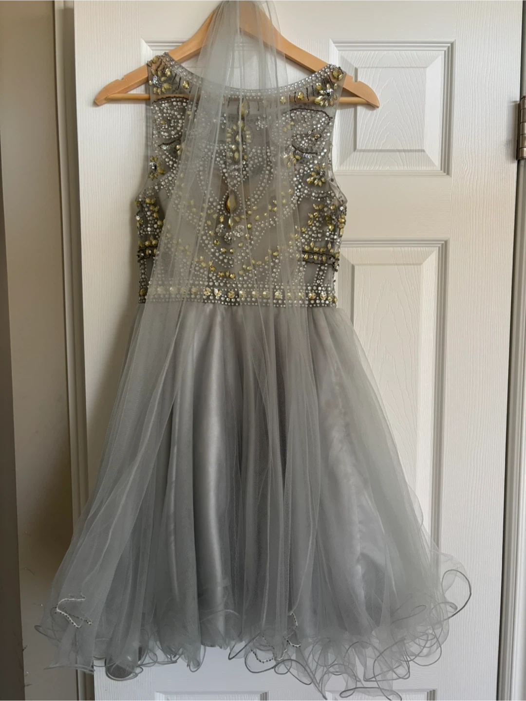 Selling a cute grey party dress! It features beautiful embellishments on the bodice and a tulle skirt. Perfect for a special occasion!