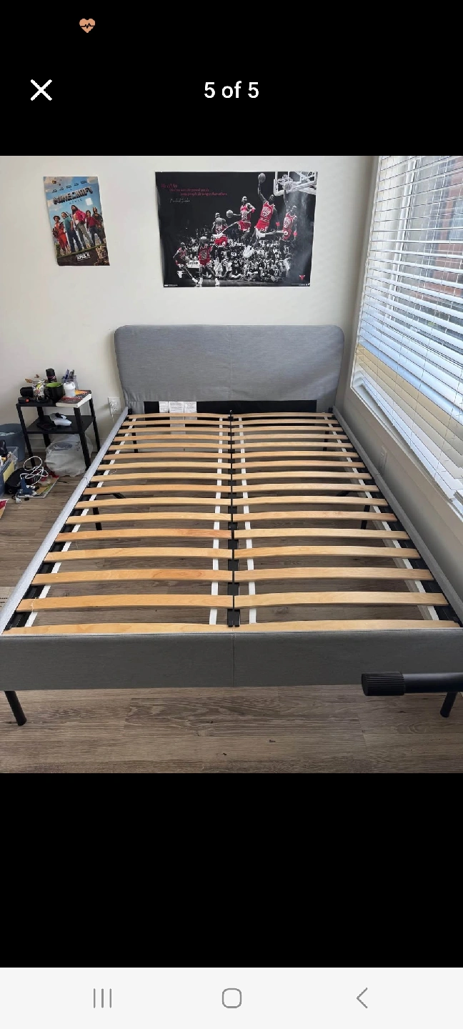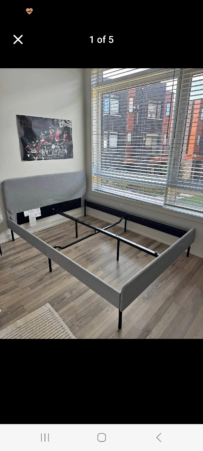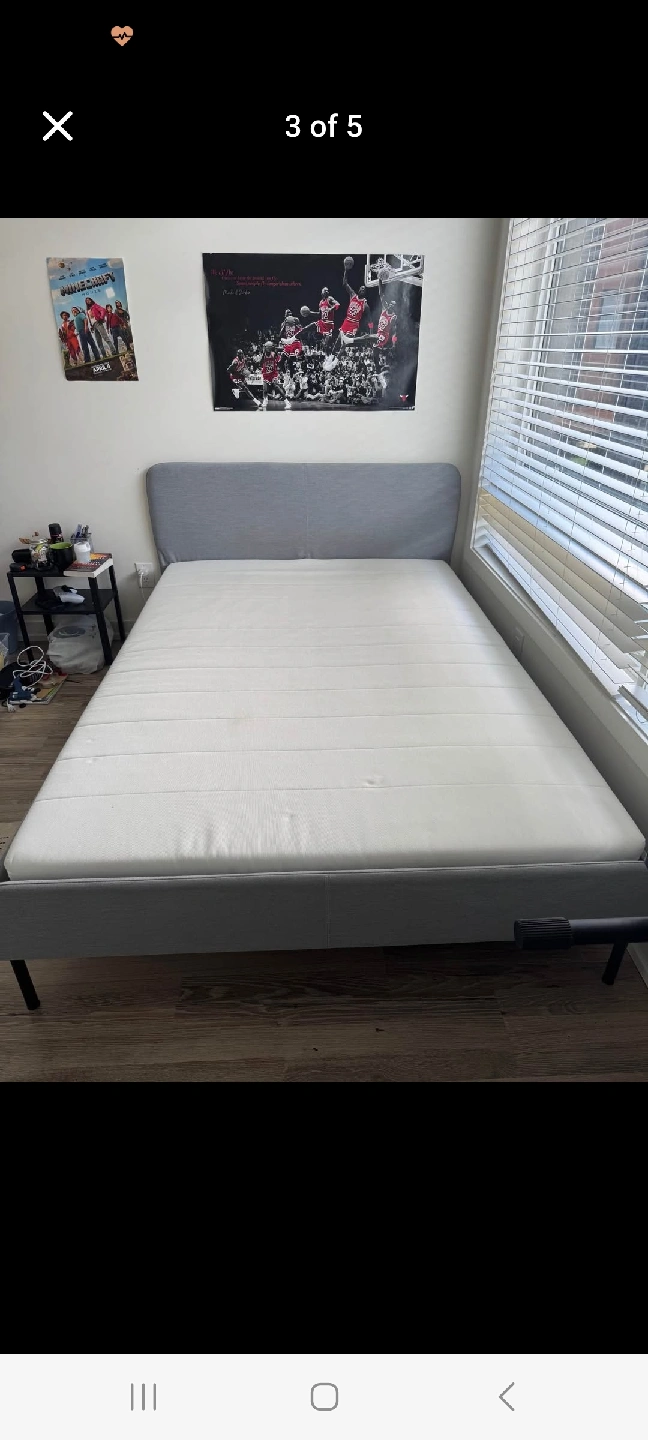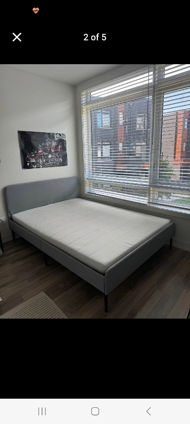 Selling a ikea-size bed frame with mattress . It's a stylish grey fabric that would look great in any bedroom. The frame is in good condition and has been well-maintained. It's easy to assemble and disassemble for moving. Perfect if you're looking for a simple and modern bed frame!