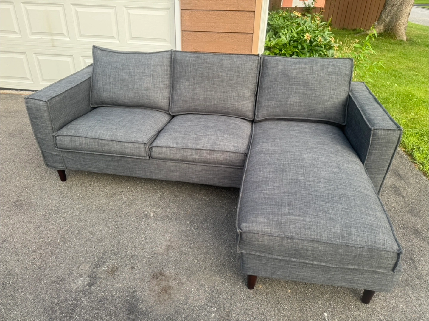 Selling a comfy grey sectional sofa! It features a chaise lounge on one side, perfect for relaxing. The fabric is a nice neutral grey that would fit well in any living room. It's in good condition and ready for a new home! Home delivery available