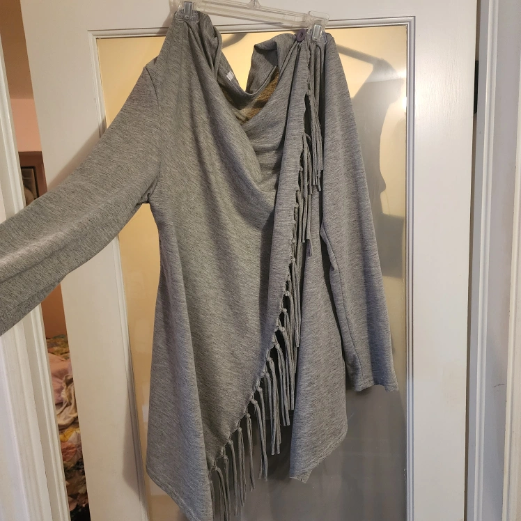 Cozy grey poncho with stylish fringe detailing! It's a one-size-fits-all and would make a great addition to your wardrobe for those cooler days