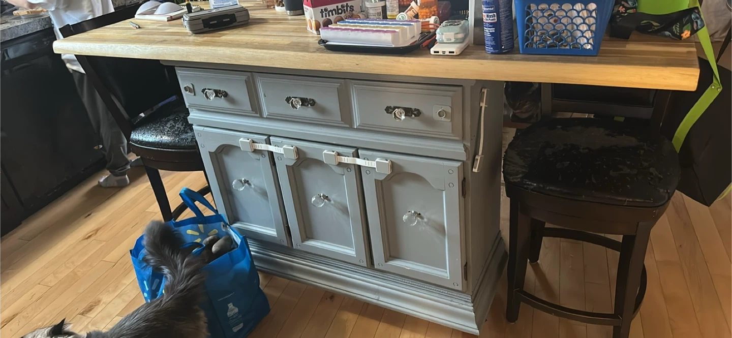 Selling a kitchen island. The island is a nice grey colour and features drawers and cabinets. It also has a butcher block countertop and locking wheels to make it easy to move around the kitchen for cleaning.
