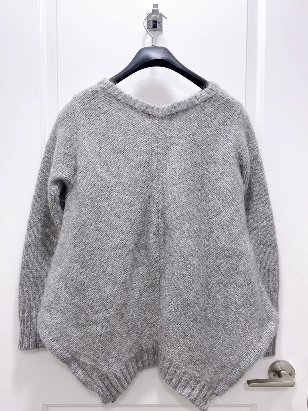 A cozy grey knit sweater. It has a unique design and a comfortable fit, great for everyday wear.