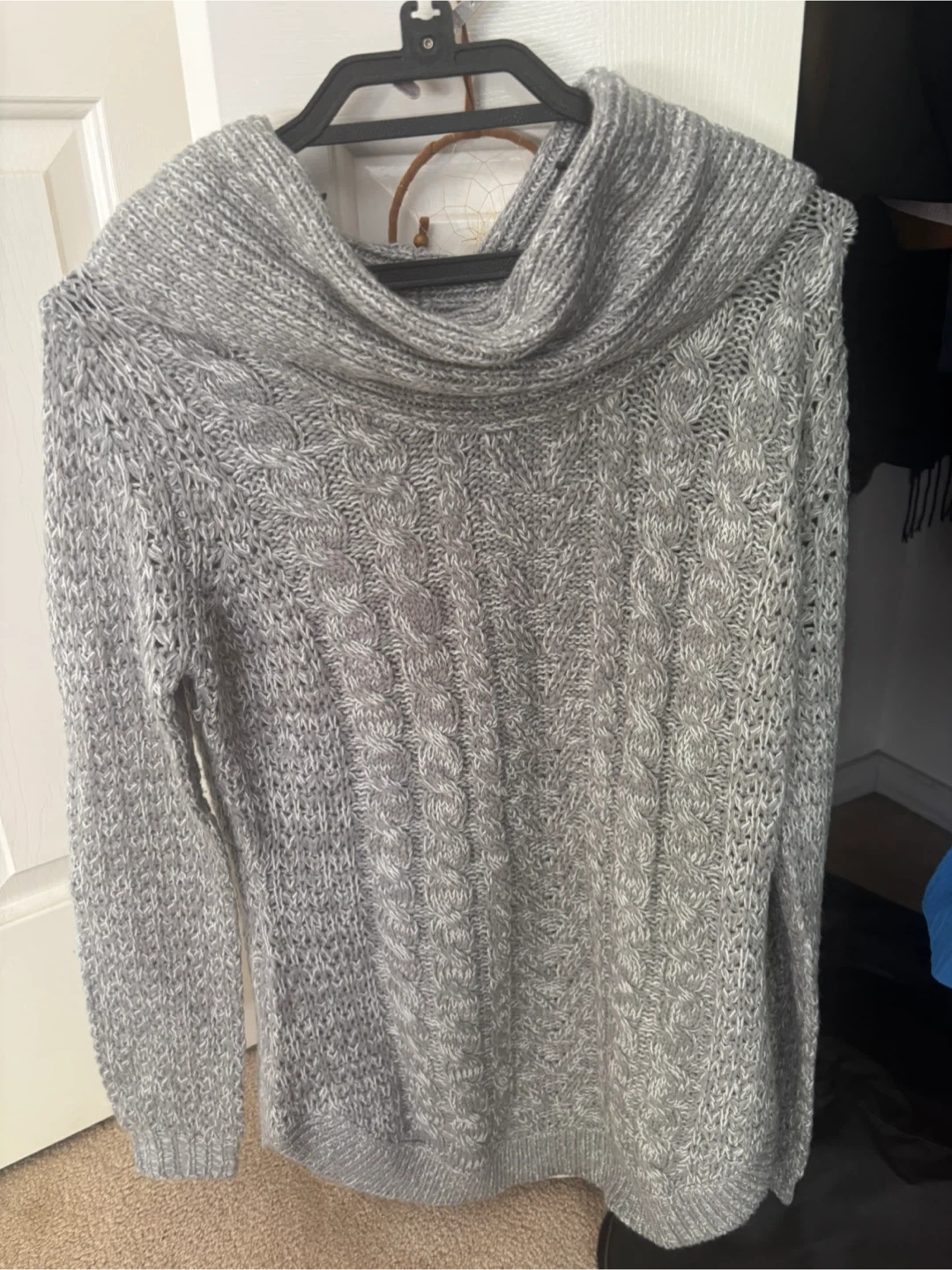 10Selling a cozy grey knit sweater! It's in great condition and perfect for layering during the cooler months. The knit pattern adds a nice touch, and the colour is super versatile