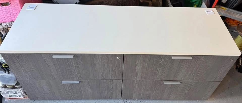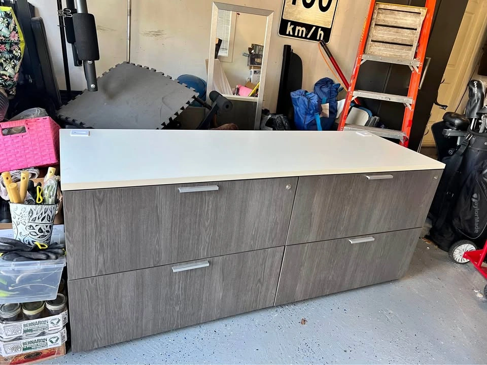 101 x Grey Lateral File Cabinet wooden Credenza. Provides ample storage and filing capability #54 I moved offices and have had this stored covered in my garage since. If you’re looking for seriously top of the line quality office cabinets, this is it. I paid just over $1100. Send me a reasonable offer if you’re interested. Serious buyers only, Thank you