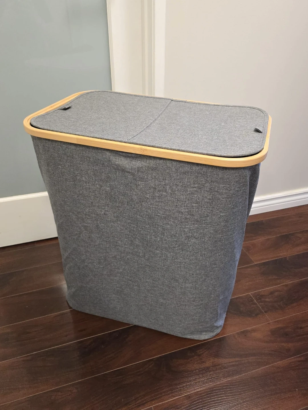 Selling a handy laundry hamper! It comes with a lid to keep things tidy. The hamper is a nice grey colour and has a wooden frame. The hamper has two removable bags with handles. It's in great condition and ready to use in your home.