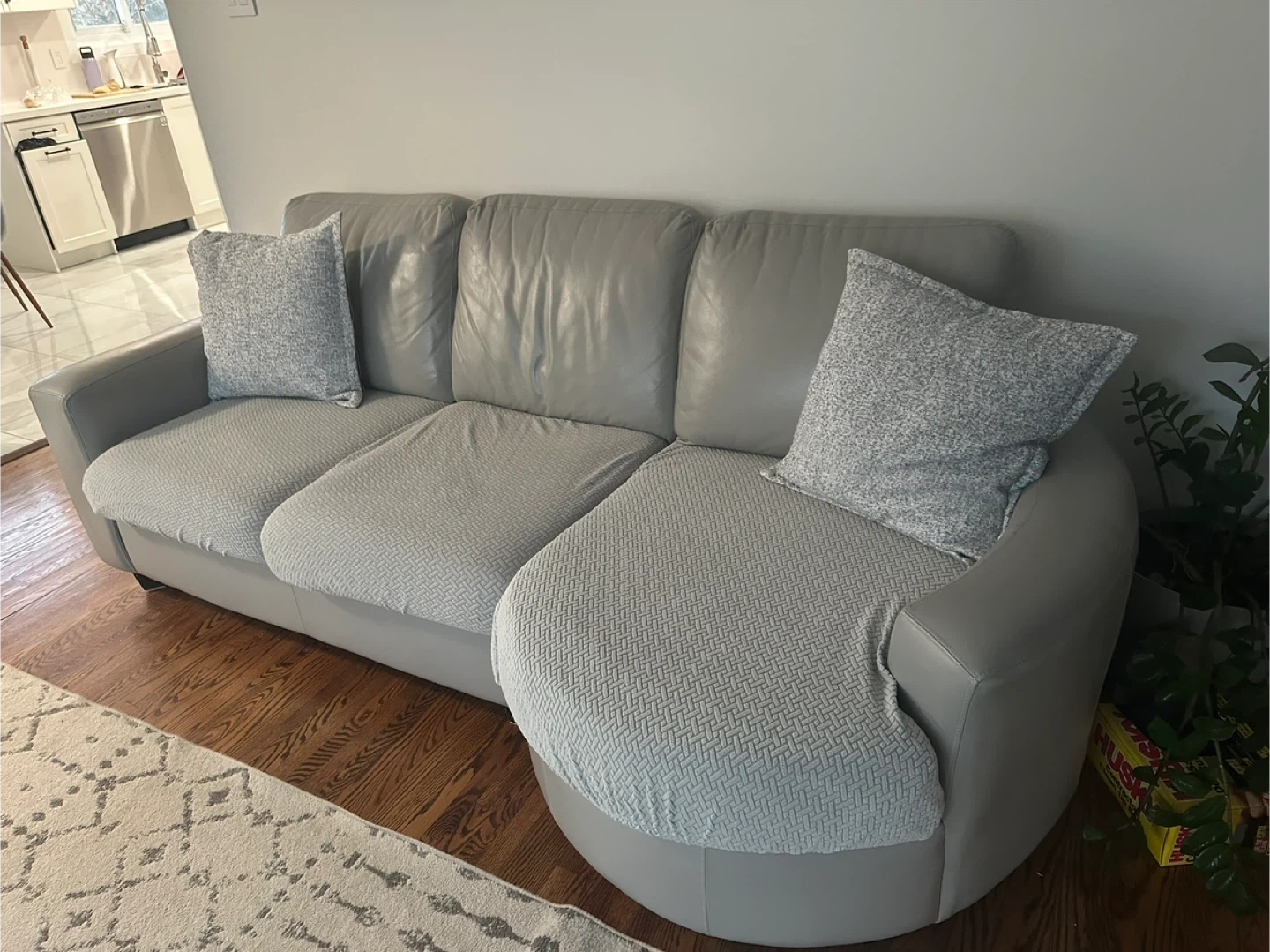 103 seater with chaise style at end . Couch cushions are scratched so if you want to invest into repairing it’s still a comfortable and beautiful leather couch . Otherwise you can keep cushion covers . 93 inches long 40inch depth 48 inch on chaise side Must be able to pick up and load on your own . Rossland and Brock st . Whitby .