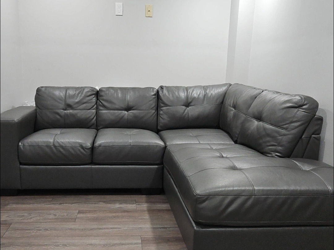 37Selling a comfortable grey leather 3 sectional sofa. It's in excellent lightly used condition and would be a great addition to any living room. Weston Road and Major Mackenzie Reason for selling: MOVING OUT OPEN TO OFFERS