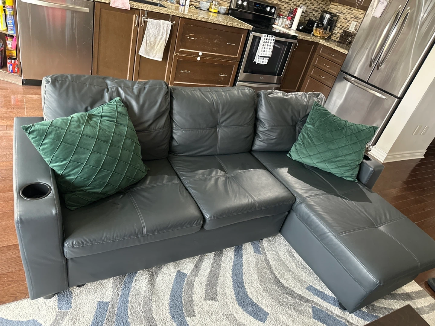 Selling a comfortable grey leather sectional sofa! It features a chaise lounge for extra relaxation and has built-in cupholders on the armrests. Perfect for a living room or family room space