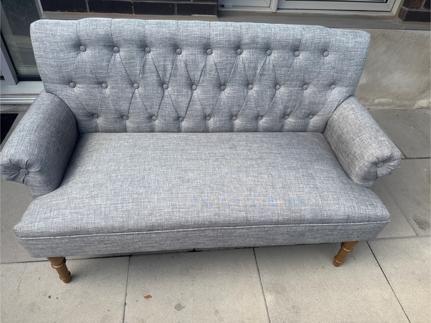 227Selling a lovely grey loveseat sofa! It features button tufting and a classic design. It's in great condition and would be a perfect addition to any living space Beautiful collection pet free or smoke free more information contact me