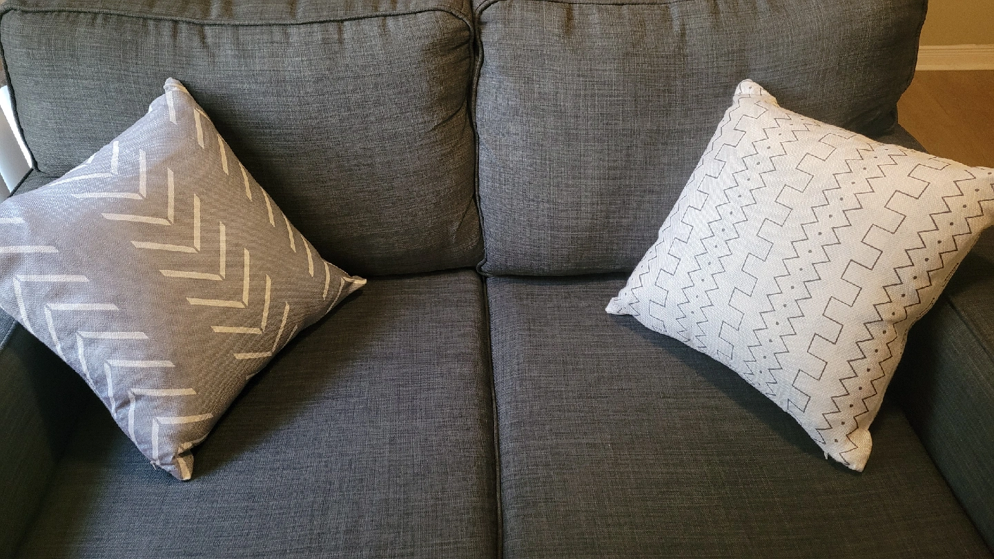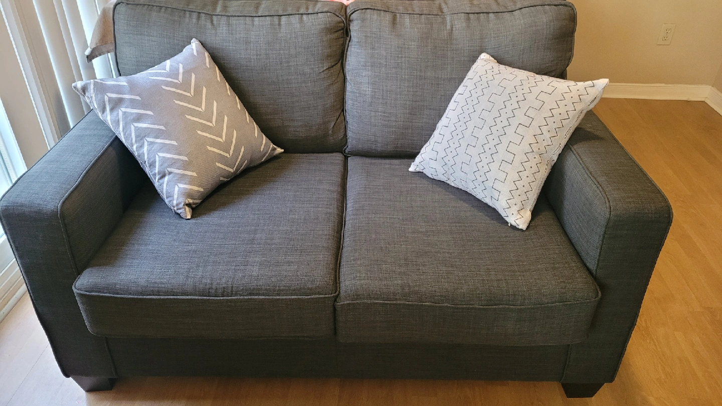 10Selling a comfy grey loveseat sofa! It comes with two throw pillows to complete the look. Perfect for a small space or apartment. In great condition and ready for a new home! Pillows are literally new. I have always stored it safe in my cupboard and never been used. It is as good as new. I'm selling my home furniture as I'm moving. All pieces are about a year old and in excellent condition — well-maintained and kept covered. Prices are negotiable, and it’s a great deal for buyers!