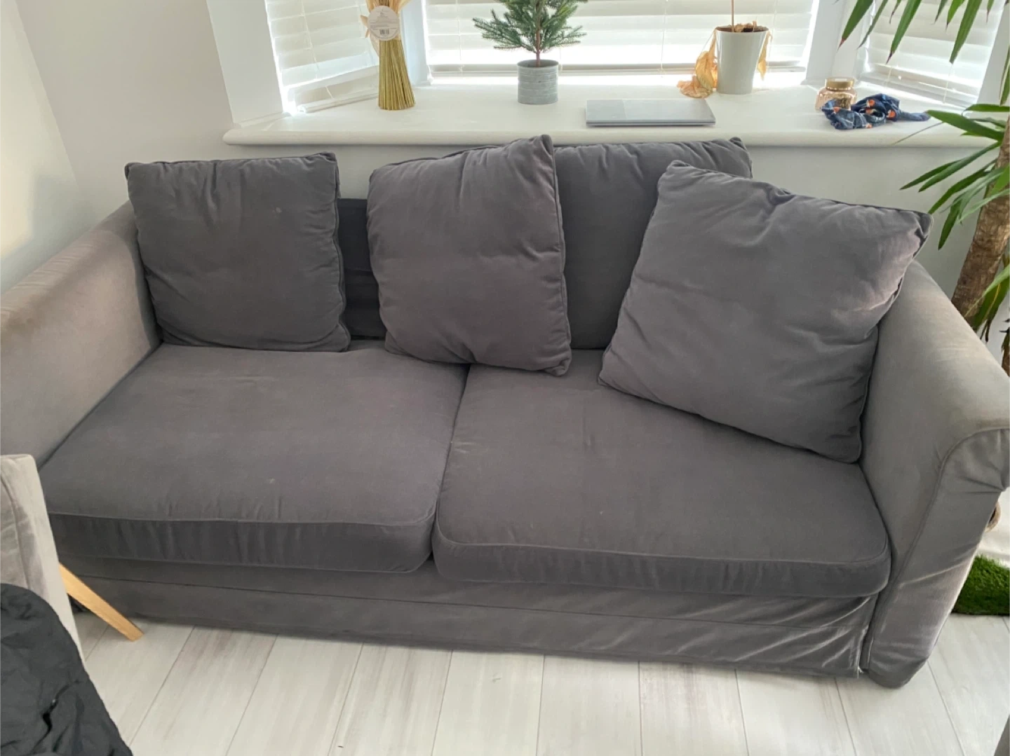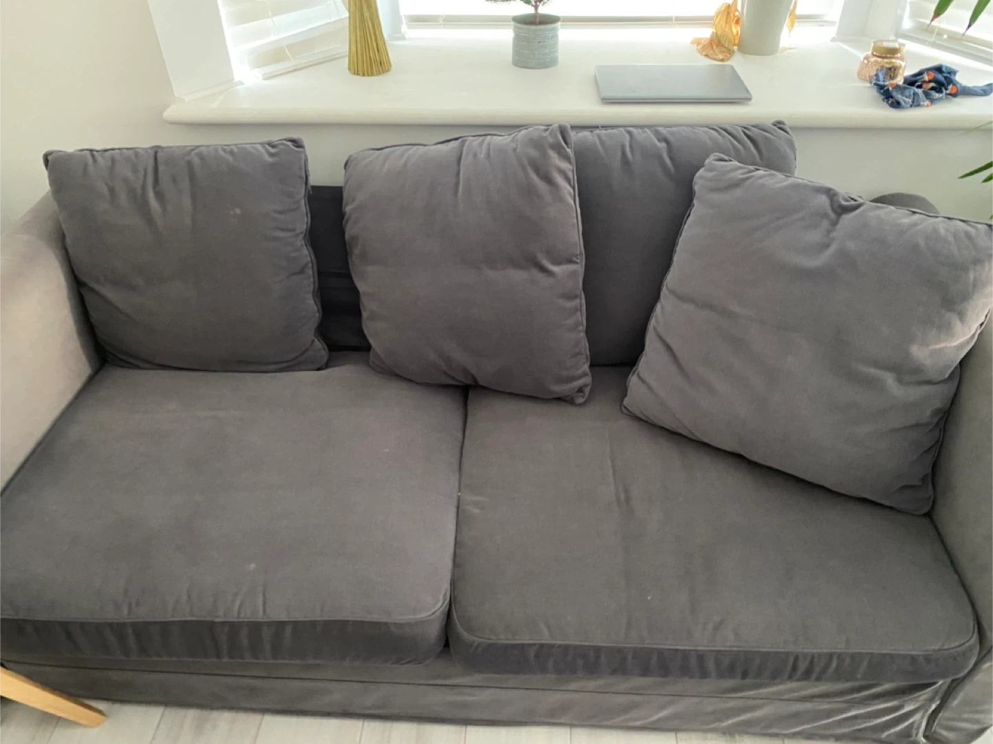 Selling a comfy grey loveseat sofa! It's in great condition and perfect for a small space. The cushions are soft and the colour is a neutral grey that will match any decor. It's been well-maintained and is ready for a new home