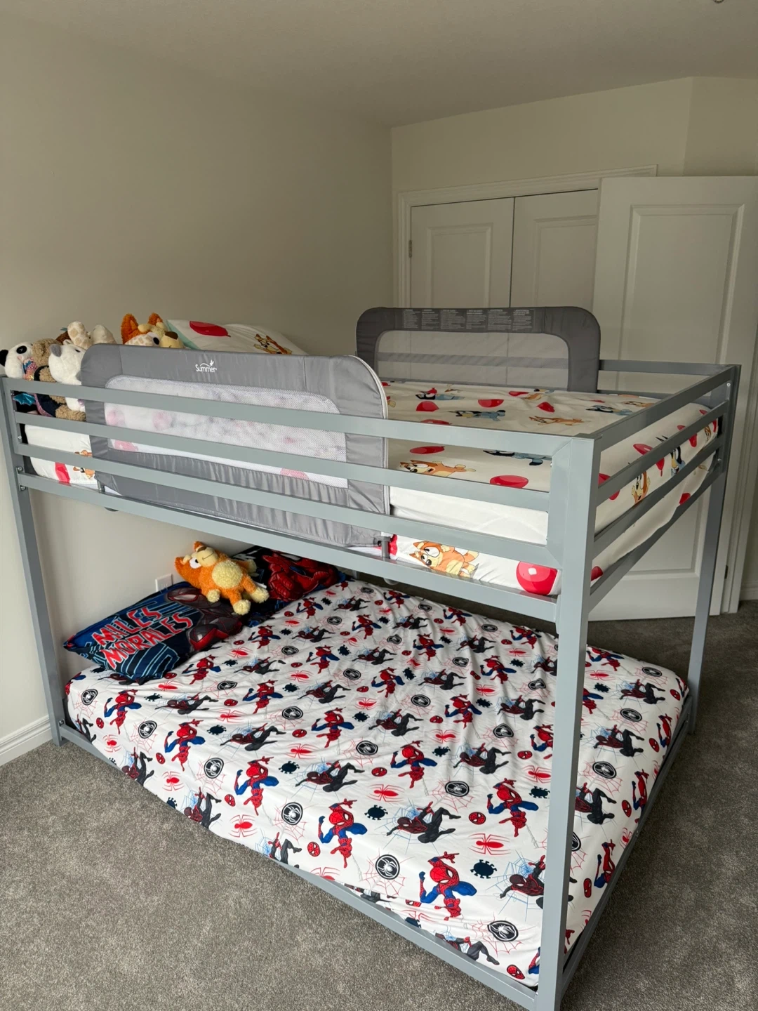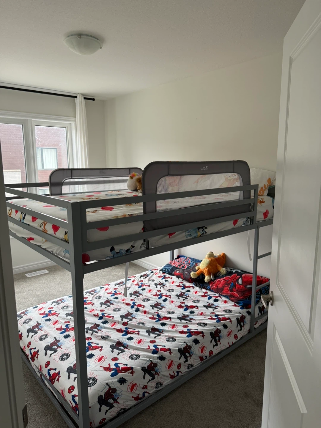 10Selling a double/full bunk bed frame in amazing condition! (Used less than 6 months). Perfect for a kids' room or guest room. It's a sturdy metal frame in a neutral grey colour that will match any decor. Full/double bed on top and bottom.