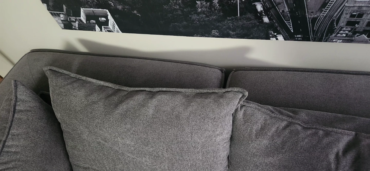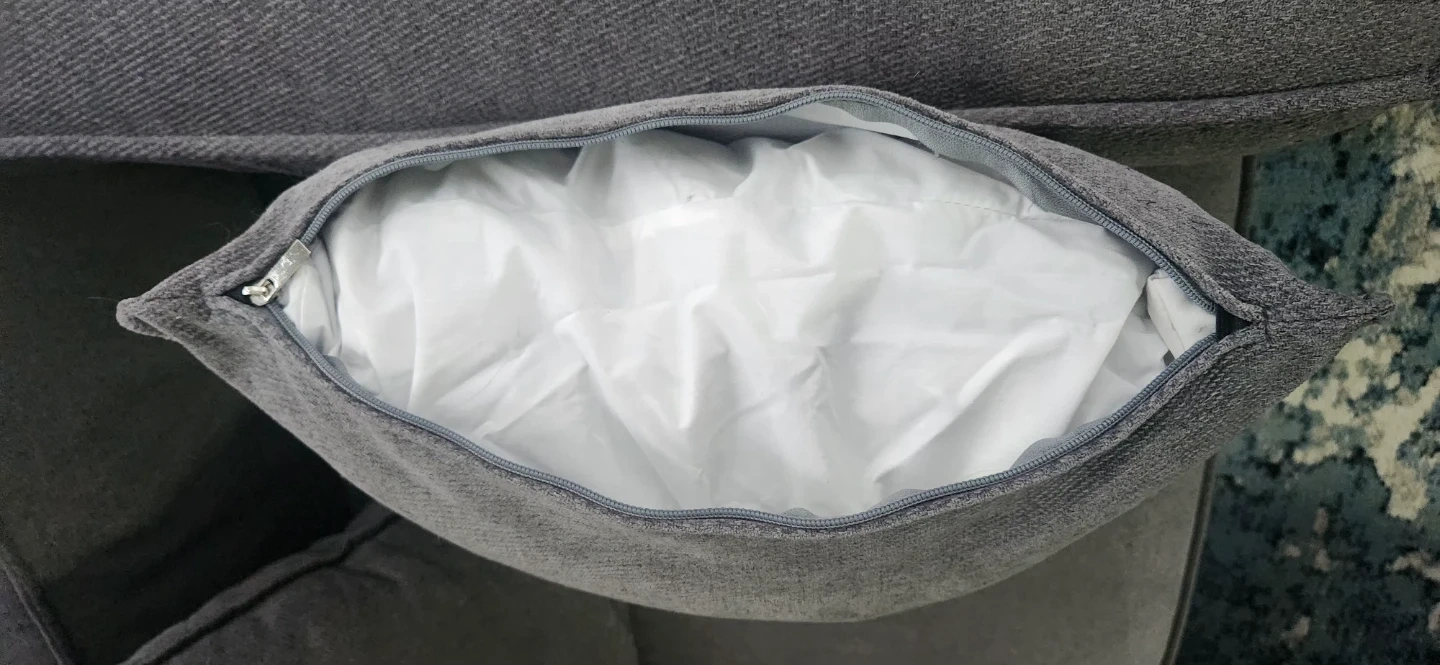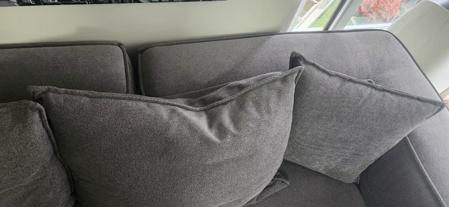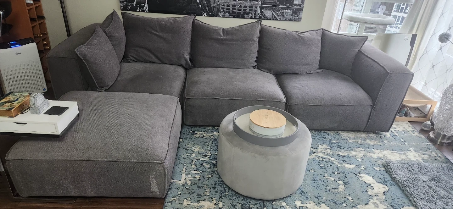 85Selling a comfortable grey modular sectional sofa. It's in good condition and ready for a new home! The 4 piece modular design allows you to configure it to fit your space perfectly. Perfect for lounging and relaxing after a long day with 3 large feather back pillows and 3 small side pillows. The feather pillows have zippered cases that come off for easy washing. There are some snags in the material but no rips or stains. Measures approximately 122" long by 41" deep by 27" (back) to 15" (seat) hight.