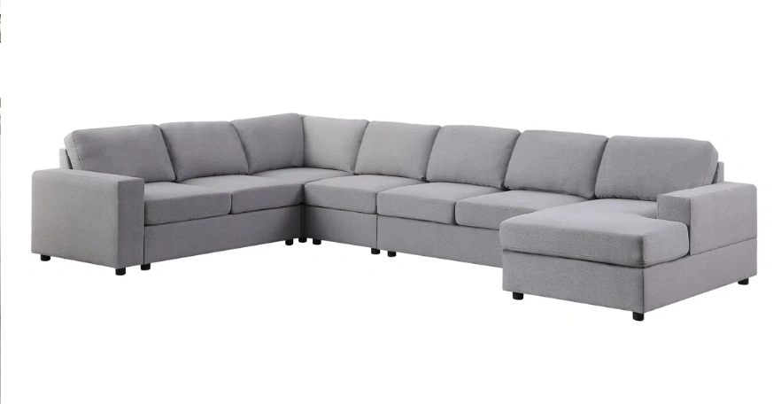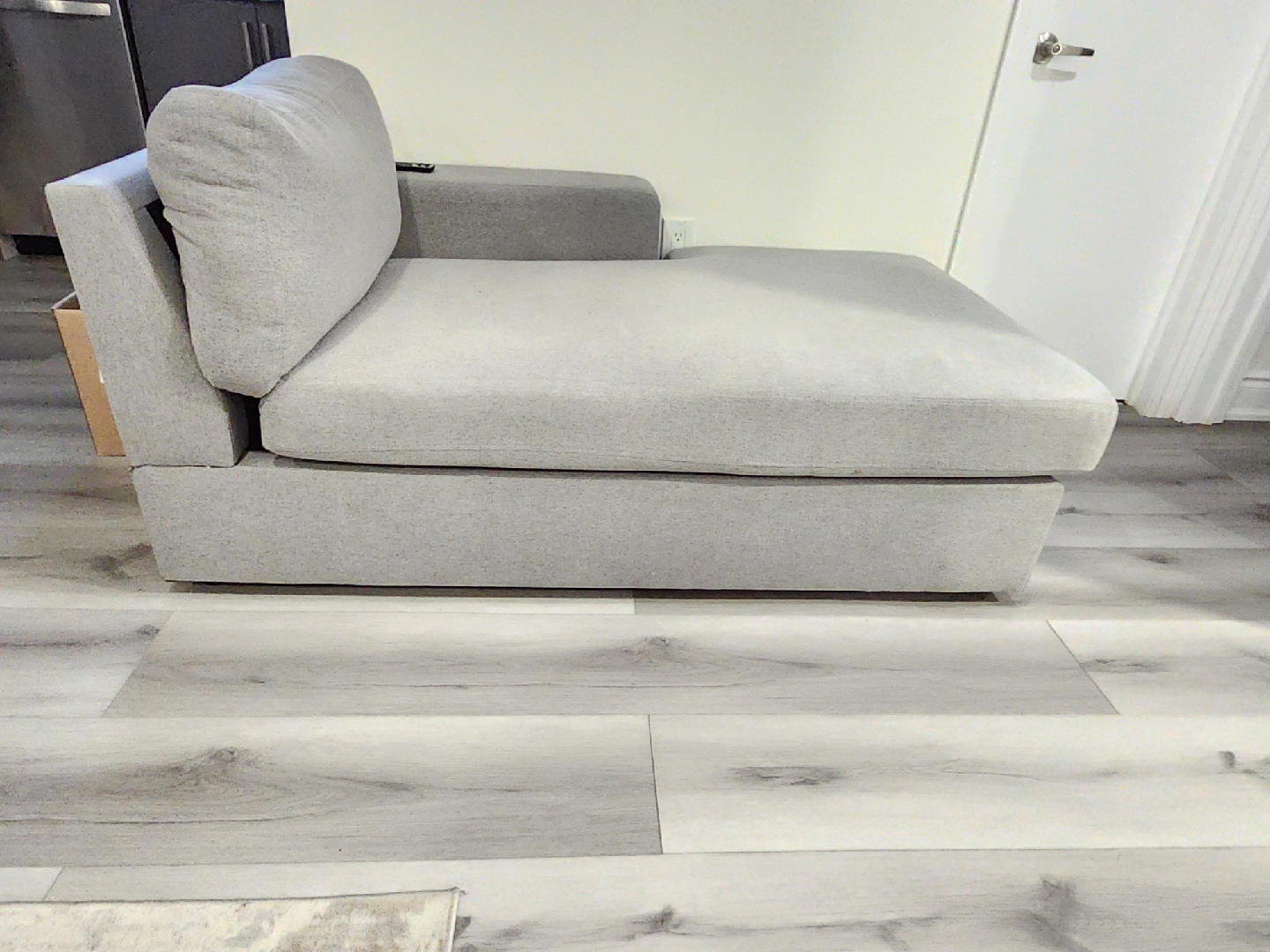 Selling a comfy grey modular sectional sofa, perfect for a living room. It comes with a large ottoman. The overall dimensions are 35" H x 147" W x 95" D. The chaise is 35" H x 34" W and each chair section is 35" H x 34" W x 35" D