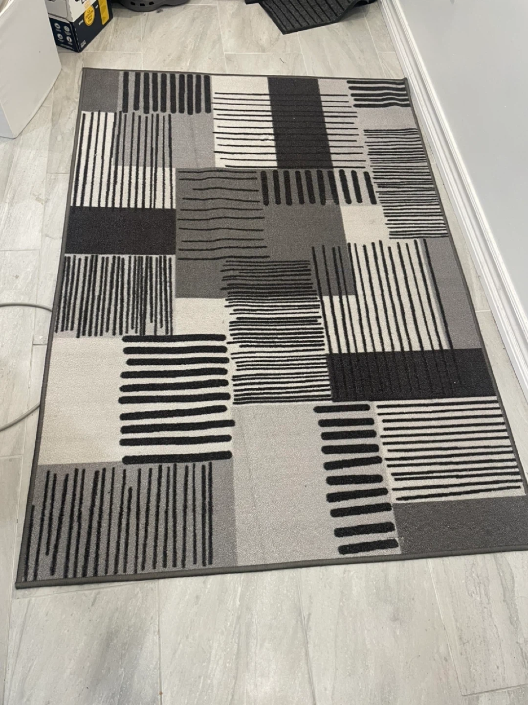 98Selling a grey patterned area rug. It features a modern geometric design with various shades of grey and black. It's in good condition and would look great in any room