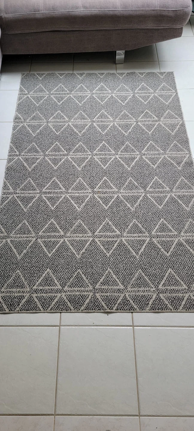 Selling a gently used area rug with a grey and white diamond pattern. It's in great shape and would look lovely in any room!