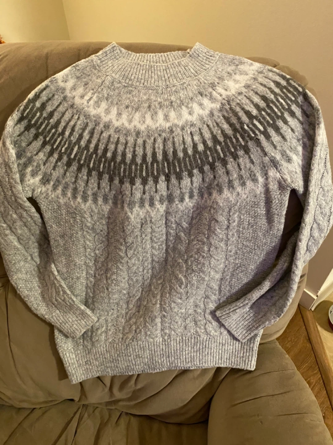 73Selling a cozy grey sweater with a nordic patterned design! It's perfect for staying warm and stylish during the cooler months.